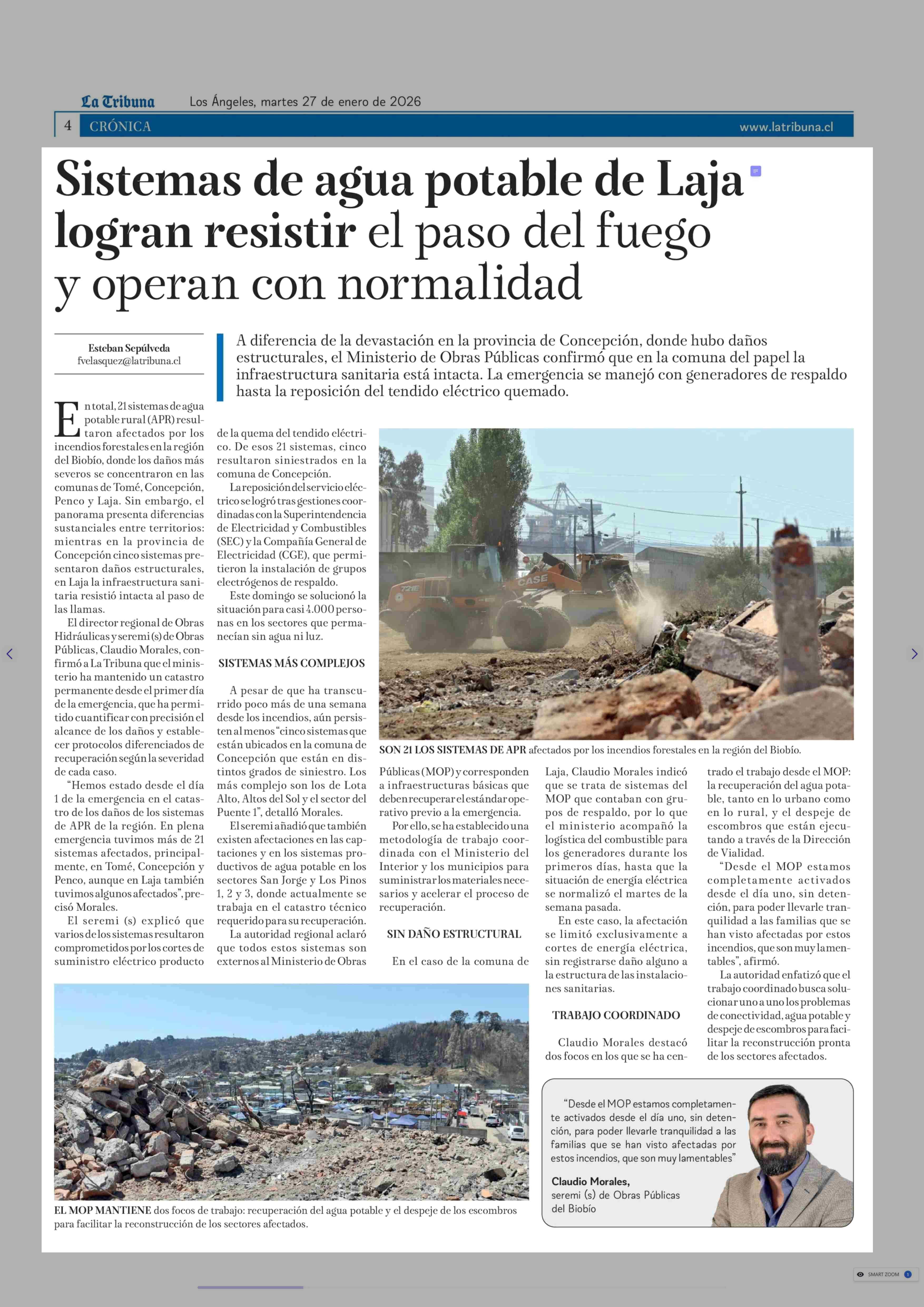Sistemas de agua potable de Laja logran resistir el paso del fuego y operan con normalidad 27-01-2026 La Tribuna |