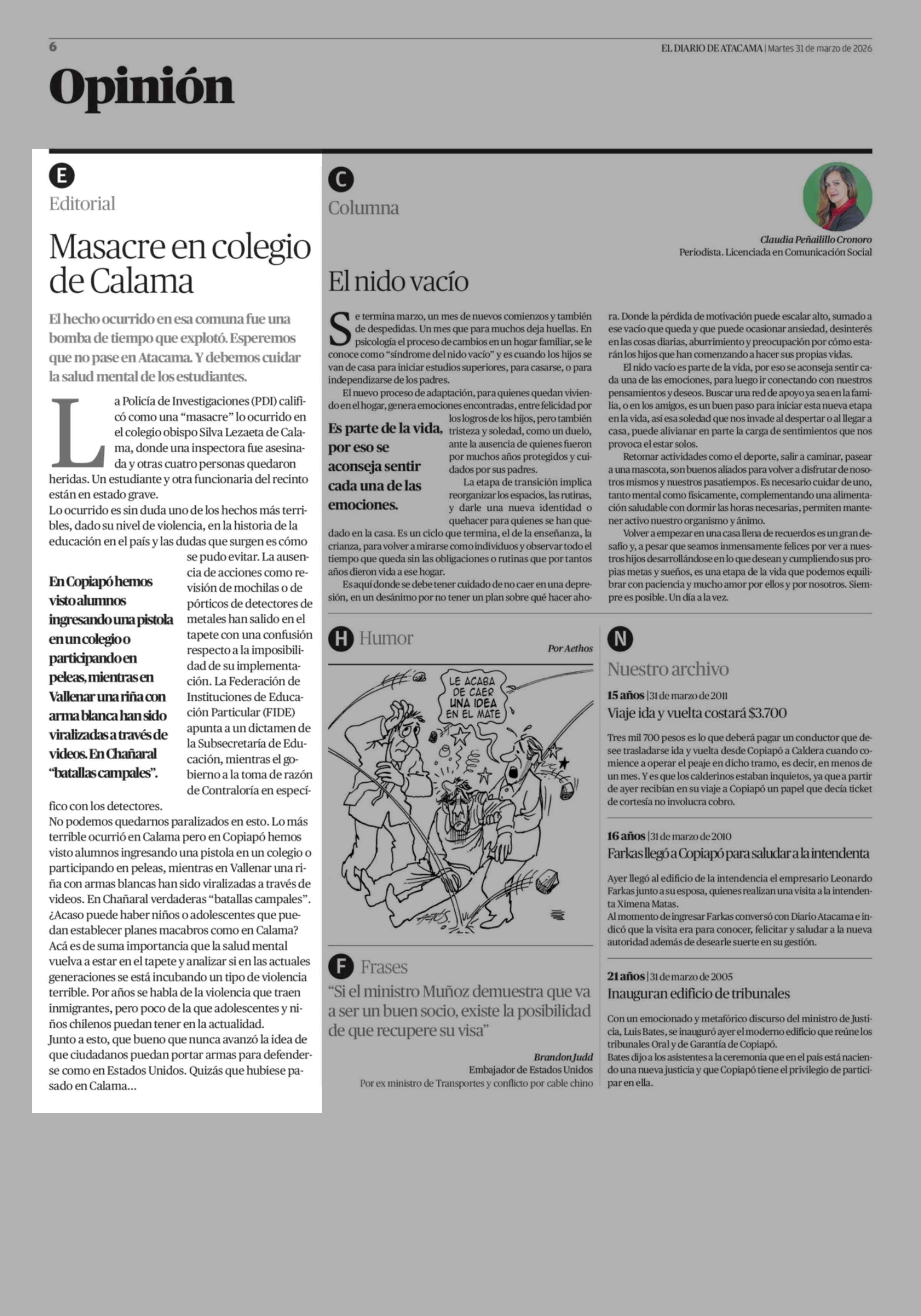 Editorial: Masacre en colegio de Calama 31-03-2026 El Diario de Atacama |
