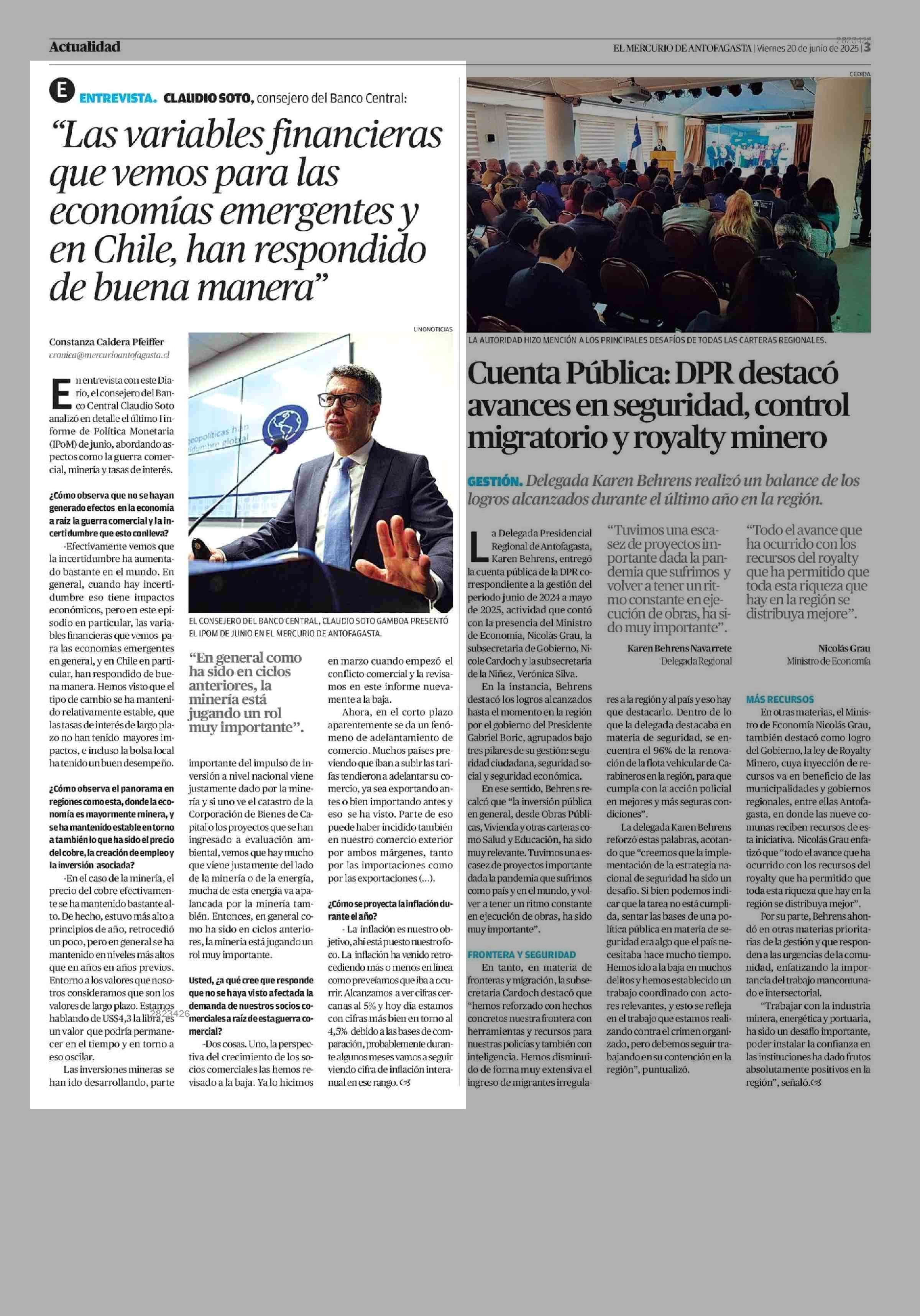 "Las variables financieras en Chile, han respondido economías emergentes y que vemos para las de buena manera" 20-06-2025 El Mercurio de Antofagasta |