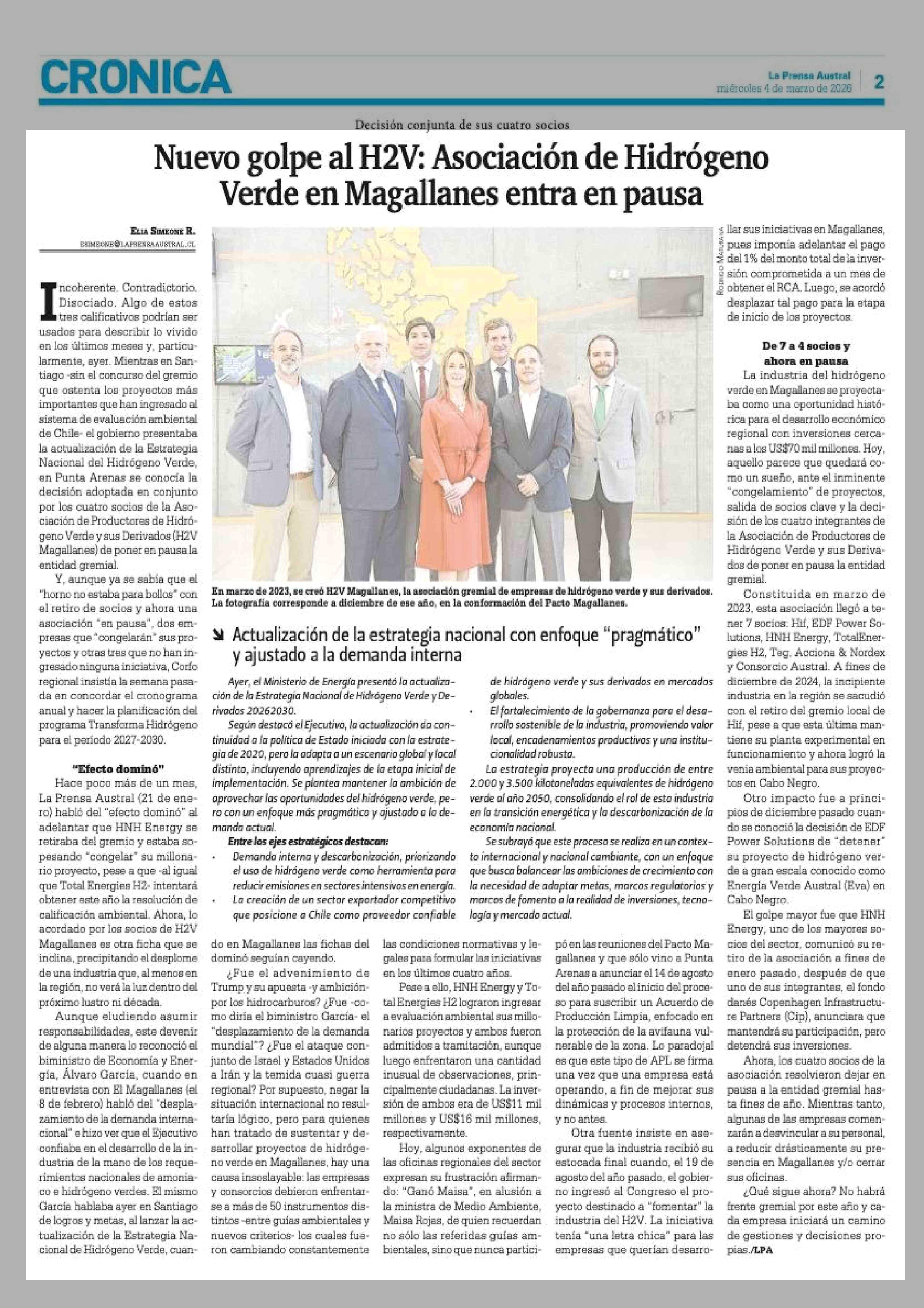 Nuevo golpe al H2V: Asociación de Hidrógeno Verde en Magallanes entra en pausa 04-03-2026 La Prensa Austral |