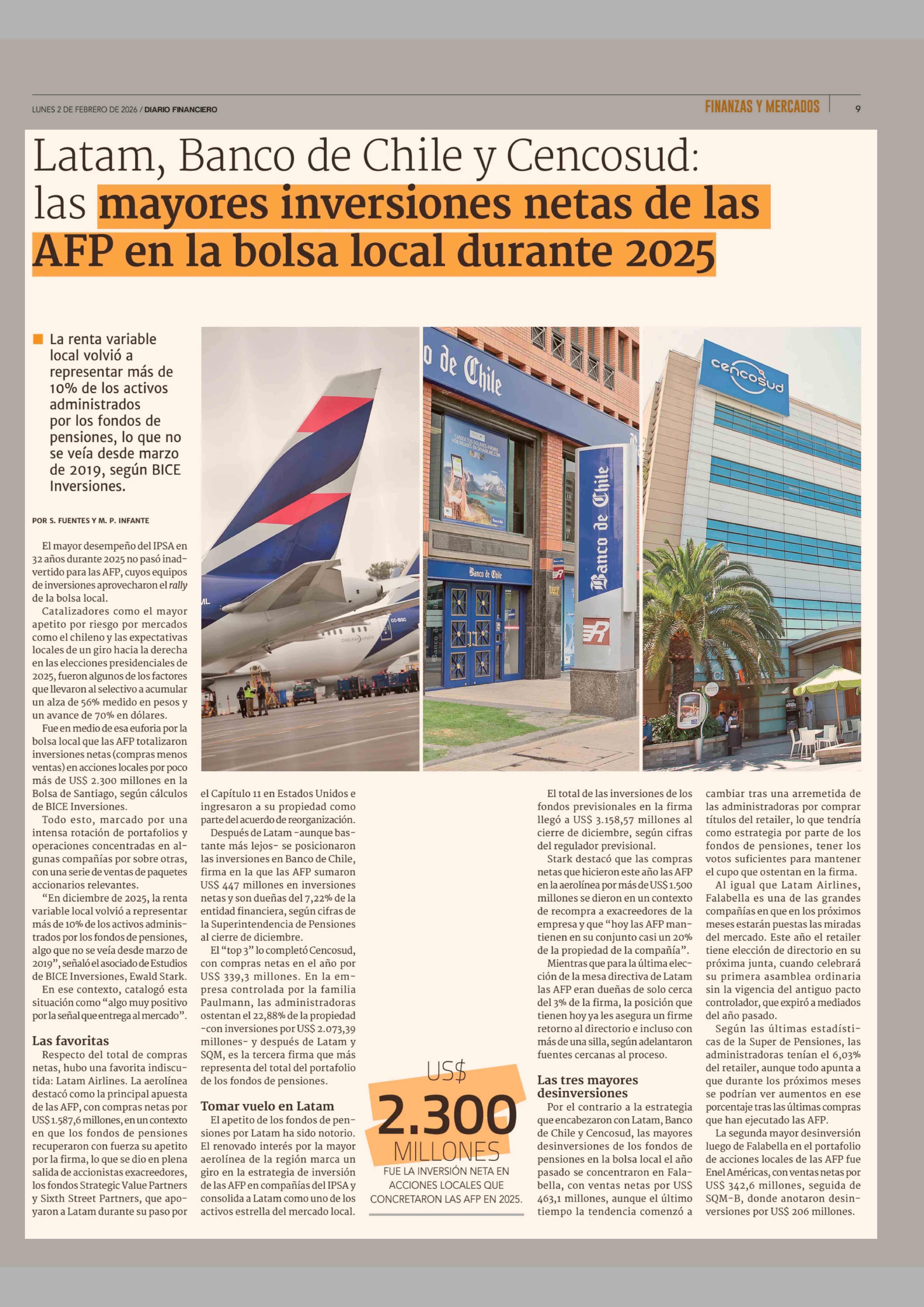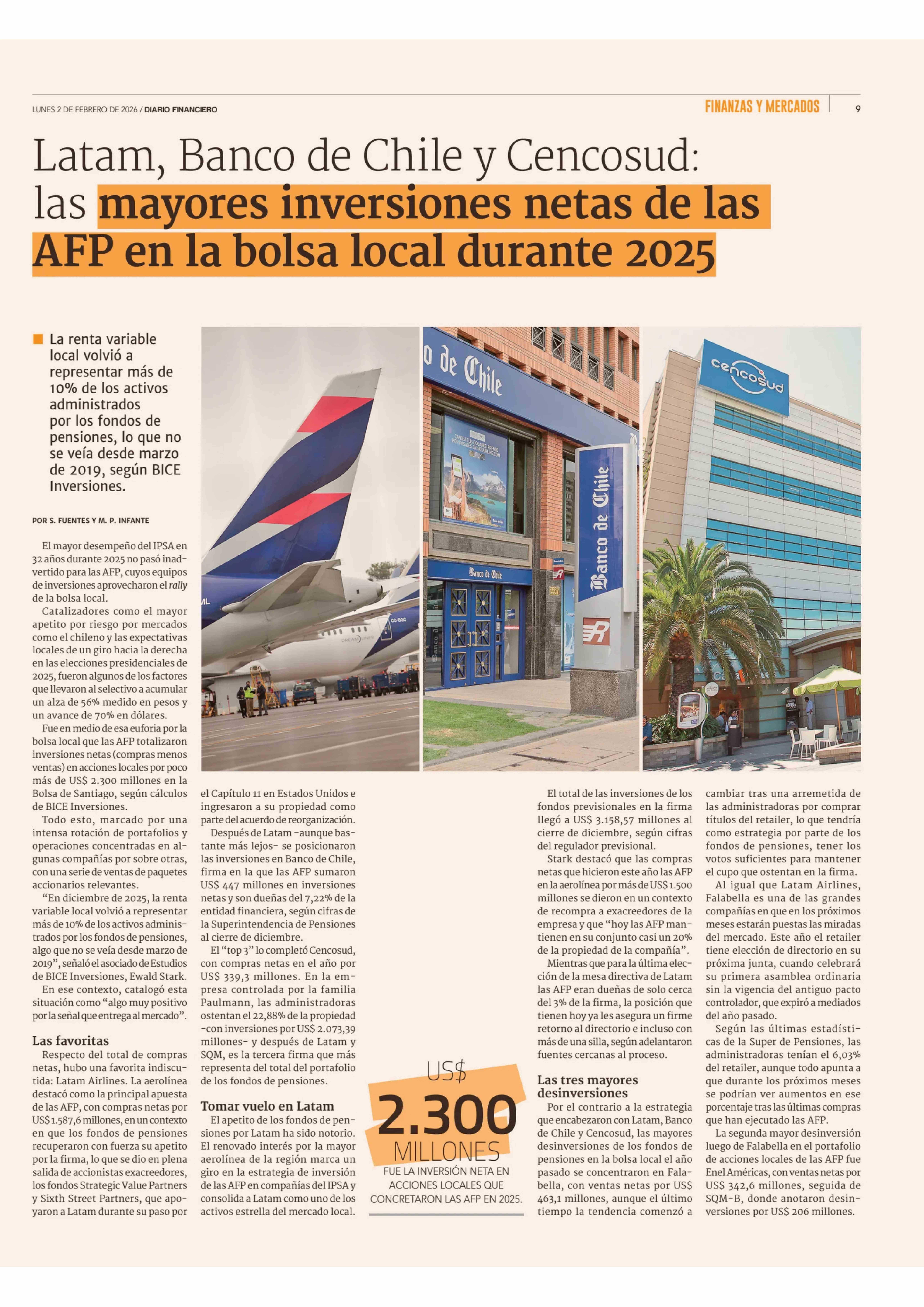 Latam, Banco de Chile y Cencosud: las mayores inversiones netas de las AFP en la bolsa local durante 2025 02-02-2026 Diario Financiero |
