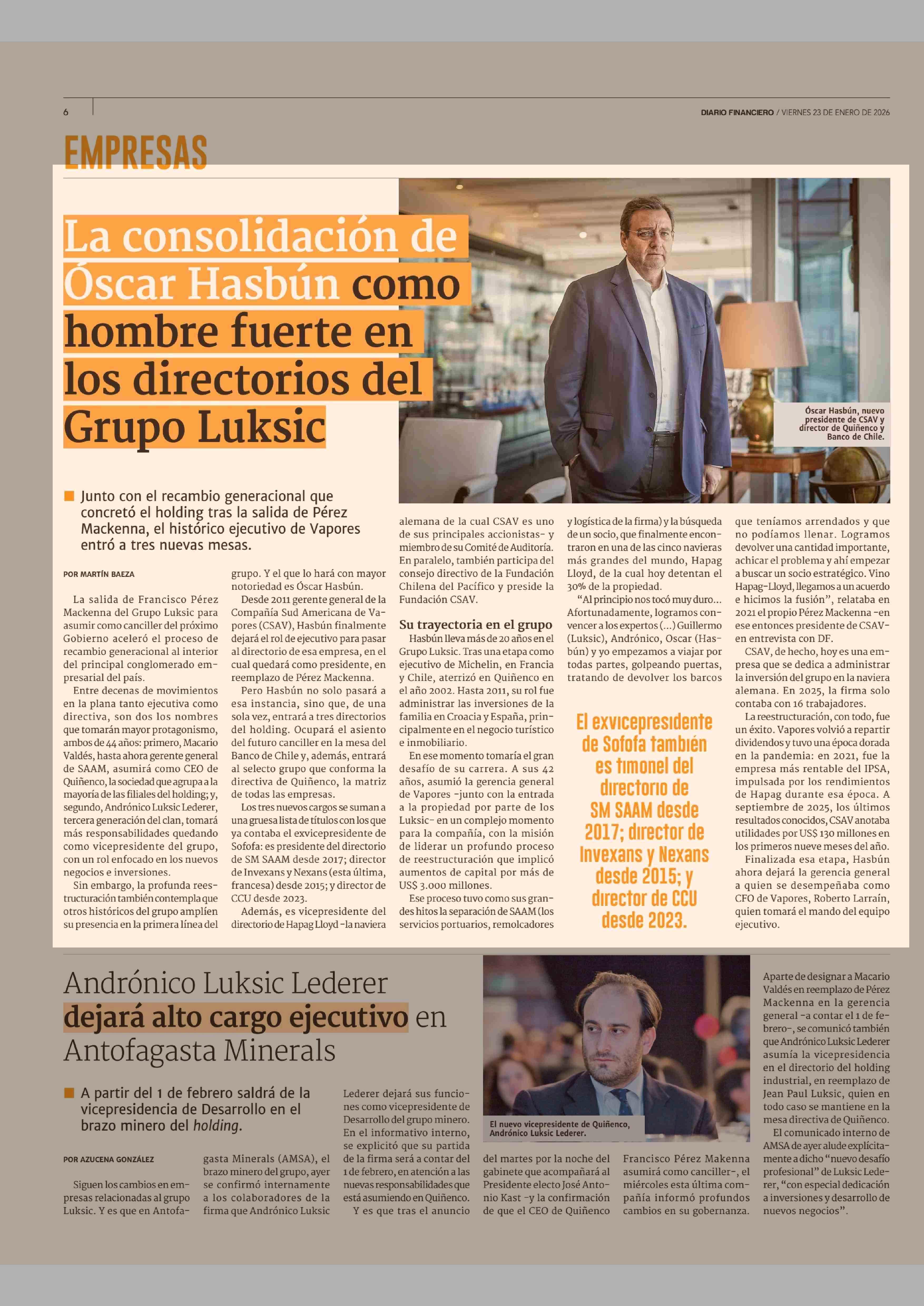 La consolidación de Óscar Hasbún como hombre fuerte en los directorios del Grupo Luksic 23-01-2026 Diario Financiero |