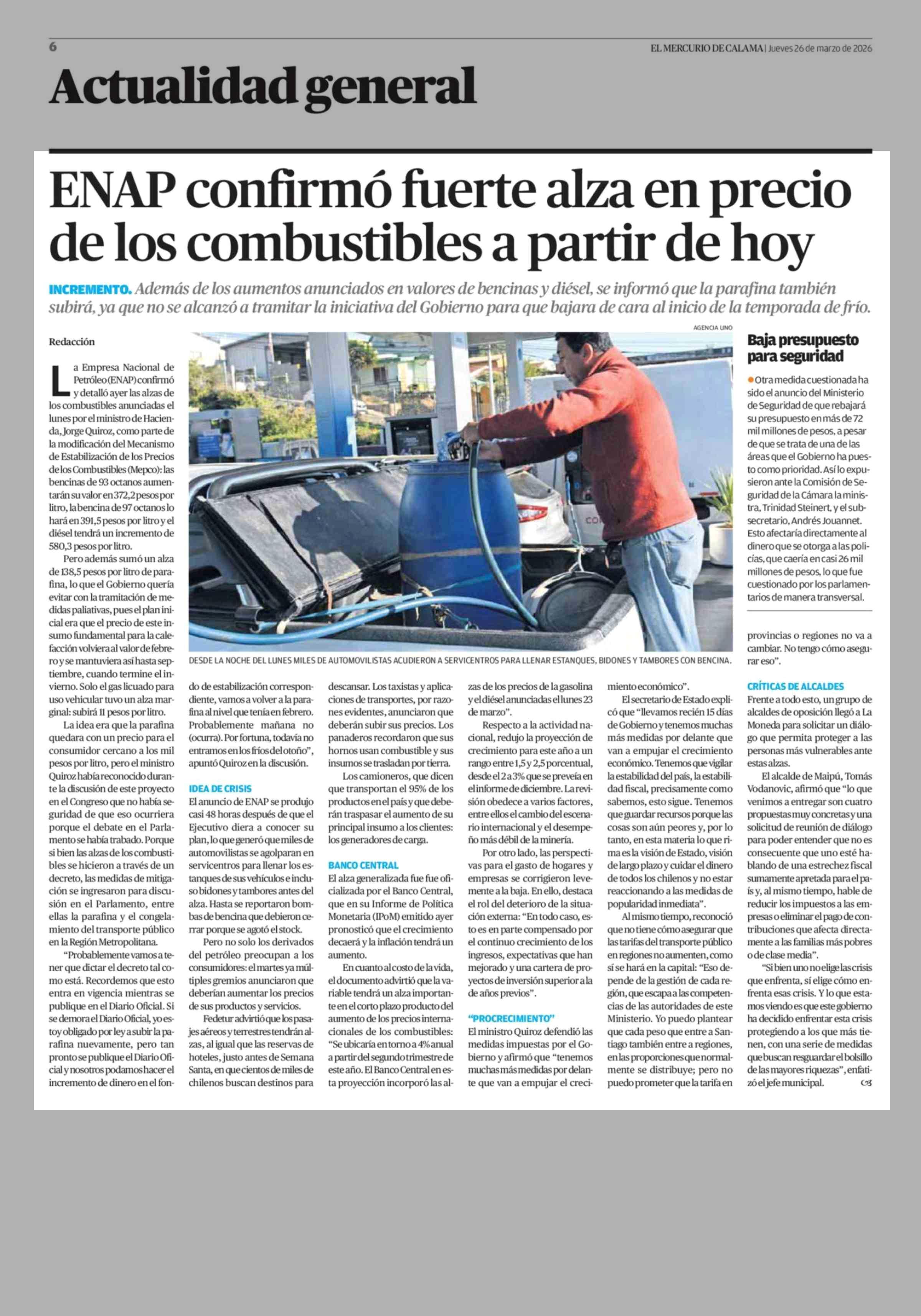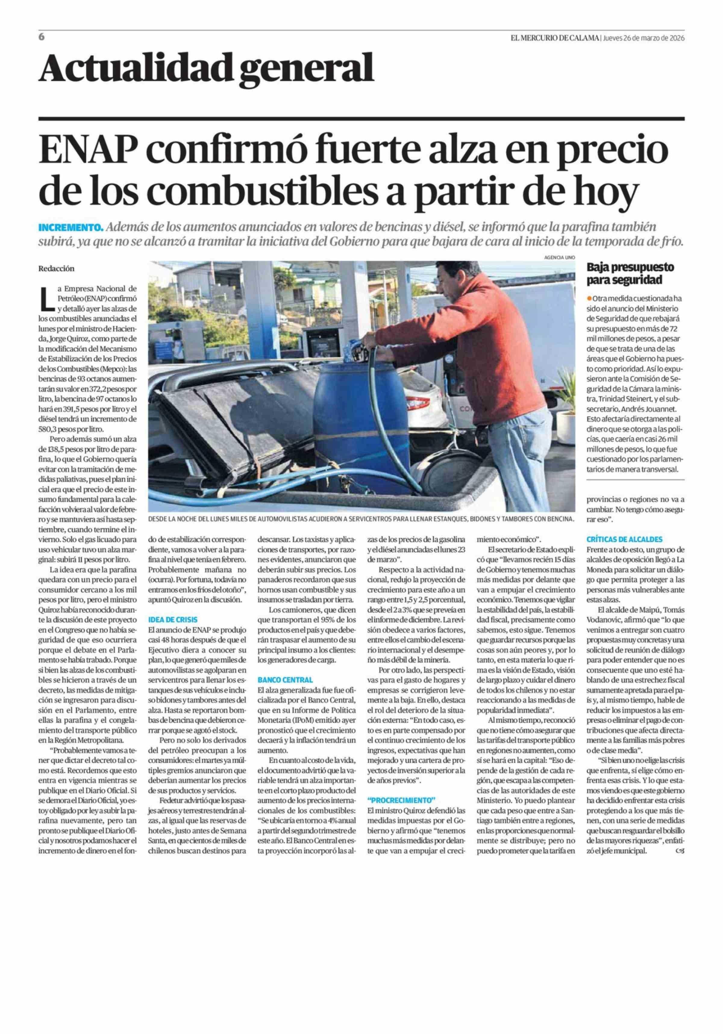 ENAP confirmó fuerte alza en precio de los combustibles a partir de hoy 26-03-2026 El Mercurio de Calama |
