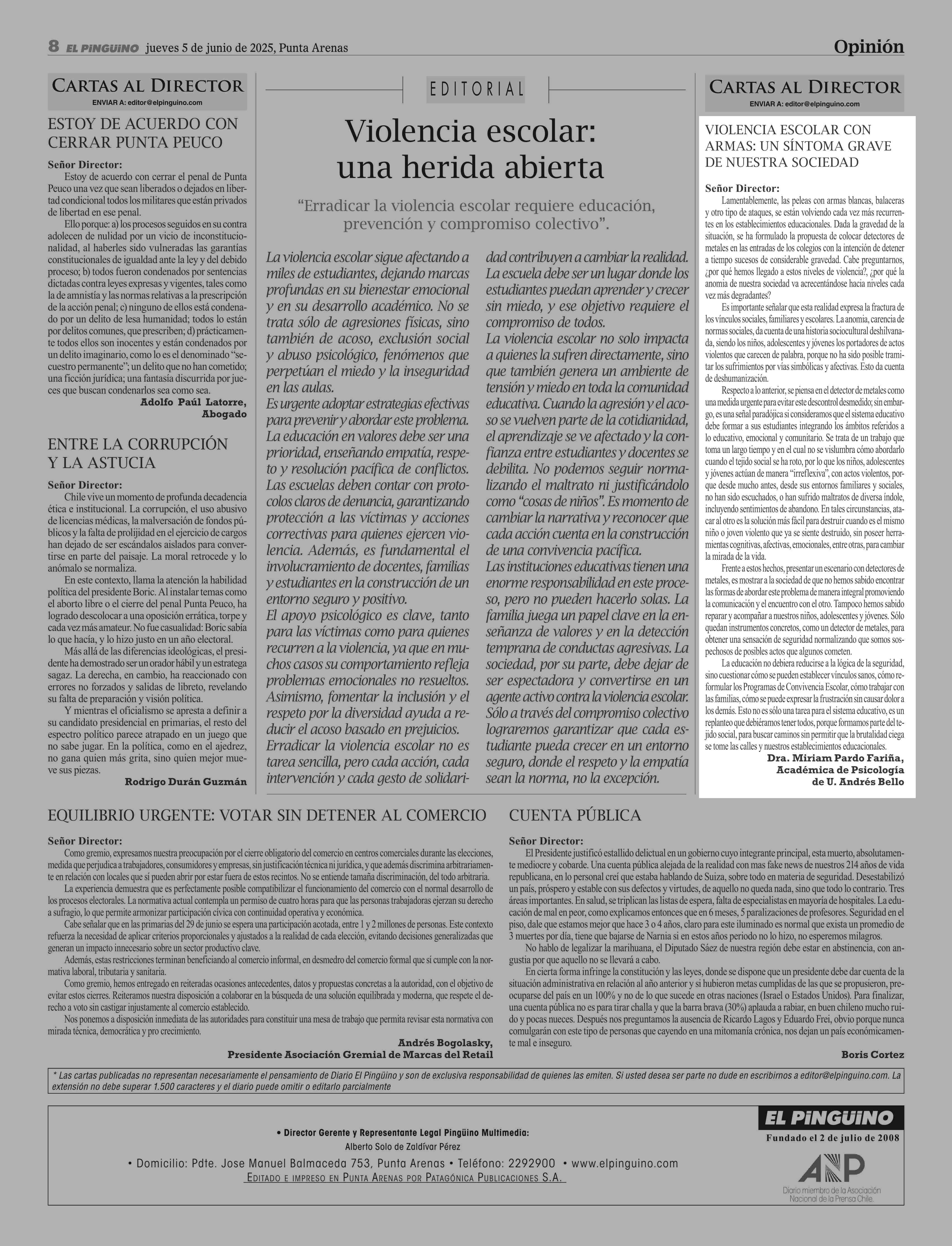CARTAS: VIOLENCIA ESCOLAR CON ARMAS: UN SÍNTOMA GRAVE DE NUESTRA SOCIEDAD