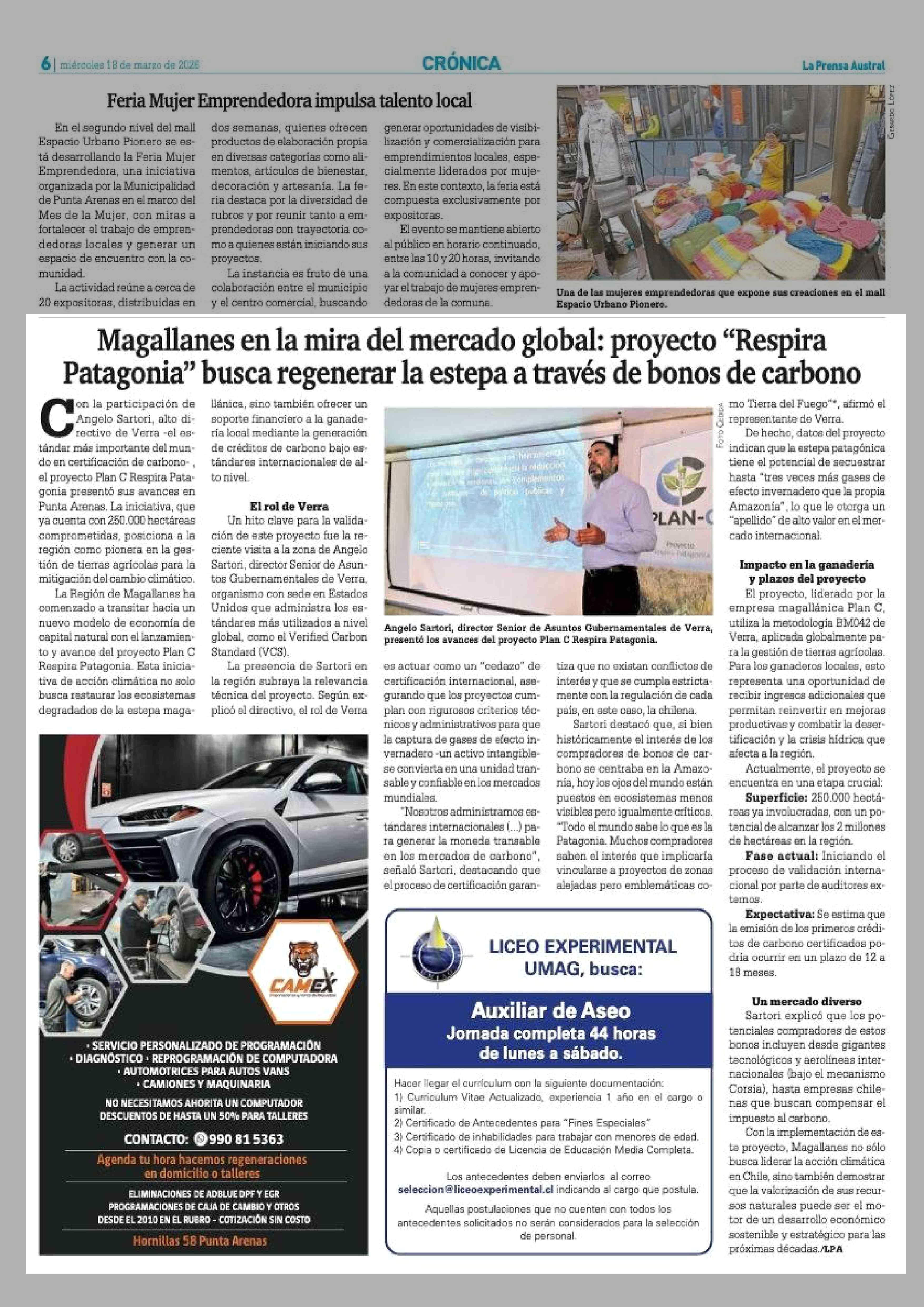 Magallanes en la mira del mercado global: proyecto "Respira Patagonia" busca regenerar la estepa a través de bonos de carbono 18-03-2026 La Prensa Austral |