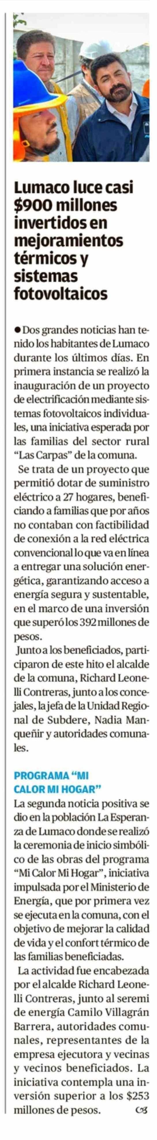 Lumaco luce casi $900 millones invertidos en mejoramientos térmicos y sistemas fotovoltaicos 08-02-2026 El Austral de la Araucanía |