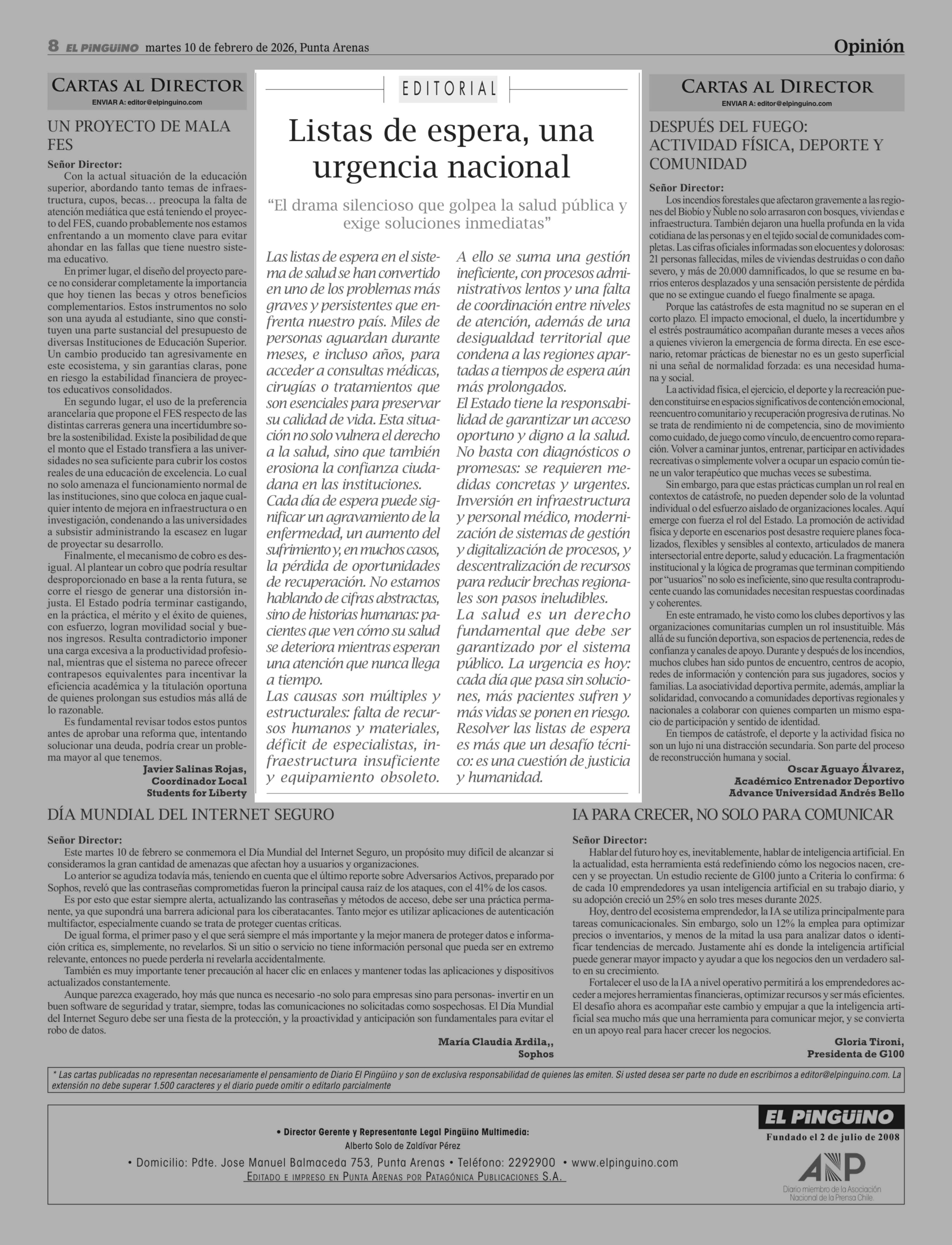 Editorial: Listas de espera, una urgencia nacional 10-02-2026 El Pingüino |