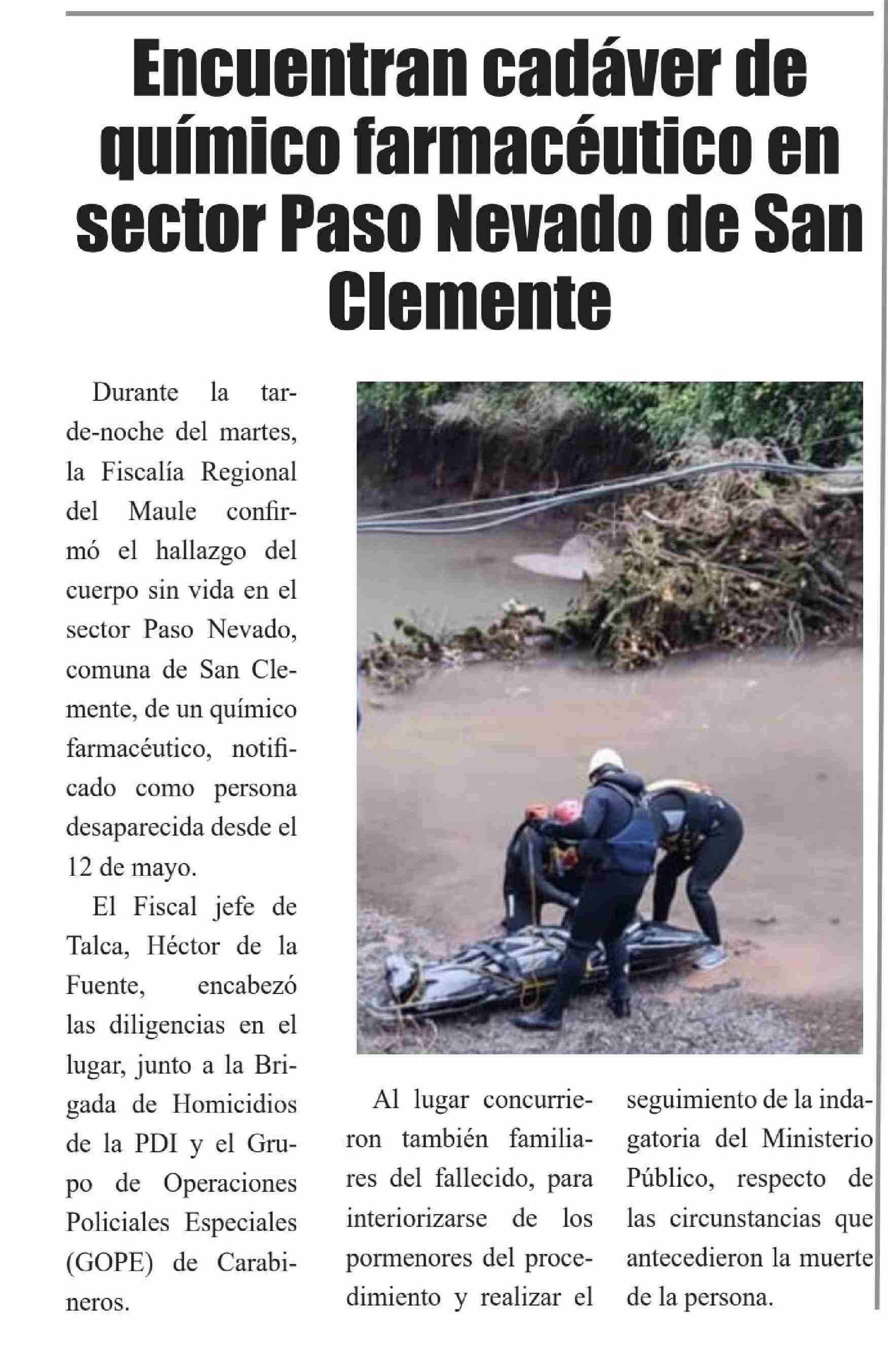 | Título: | Encuentran cadáver de quimico farmaceuta en sector Paso Nevado de San Clemente |