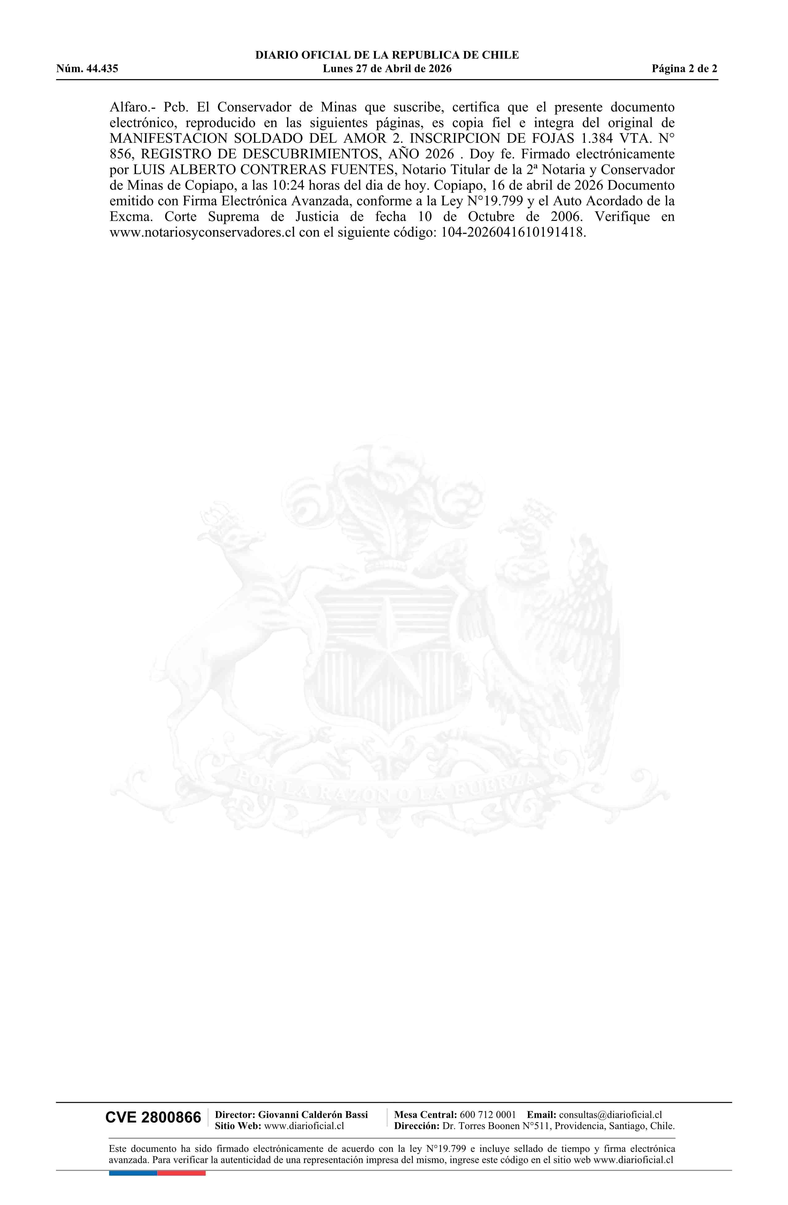 SOLDADO DEL AMOR 2 / Compañía Minera del Pacífico S.A. 27-04-2026 DIARIO OFICIAL CHILE - BOLETÍN OFICIAL DE MINERÍA |