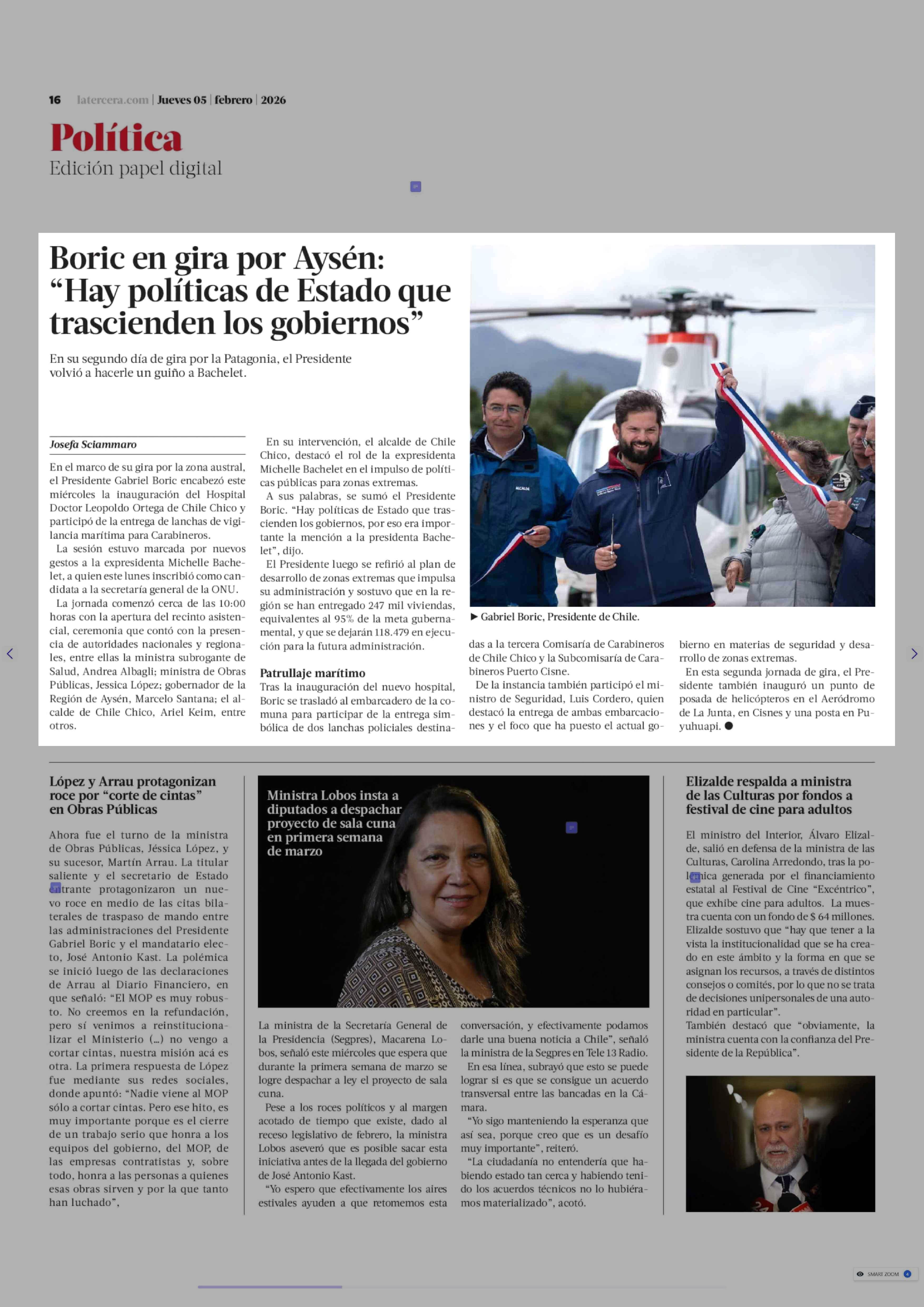Boric en gira por Aysén: "Hay políticas de Estado que trascienden los gobiernos" 05-02-2026 La Tercera |