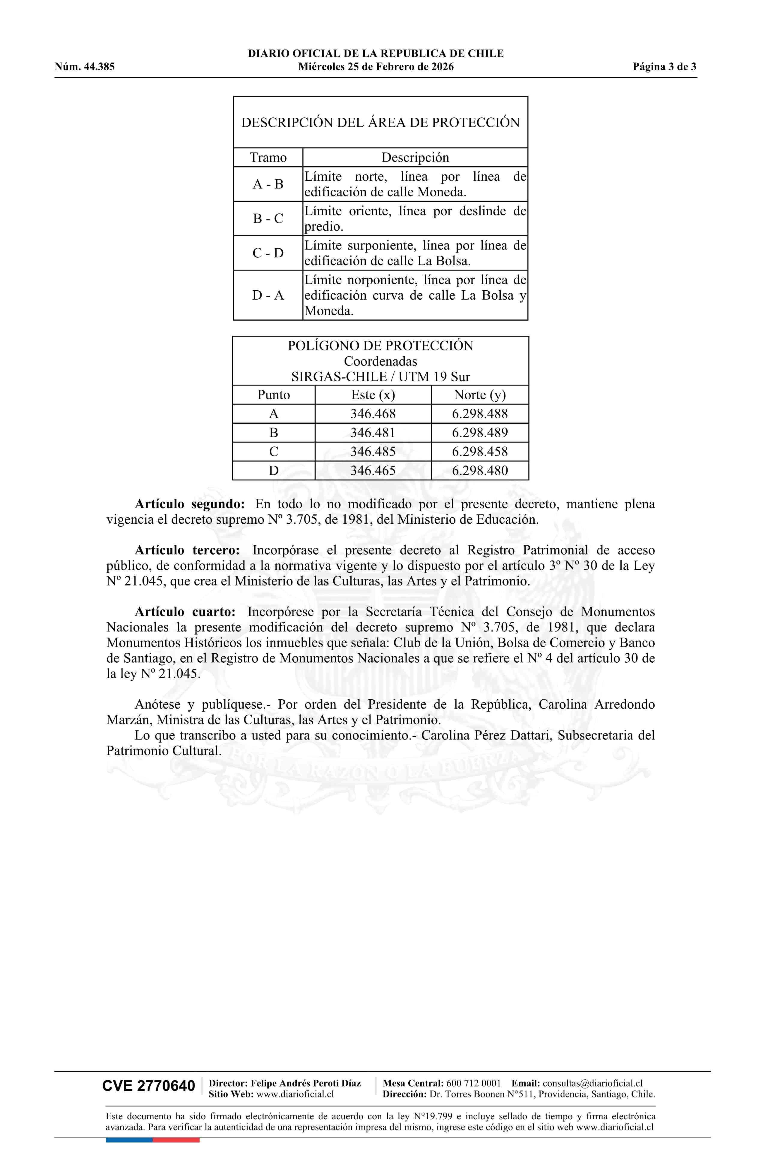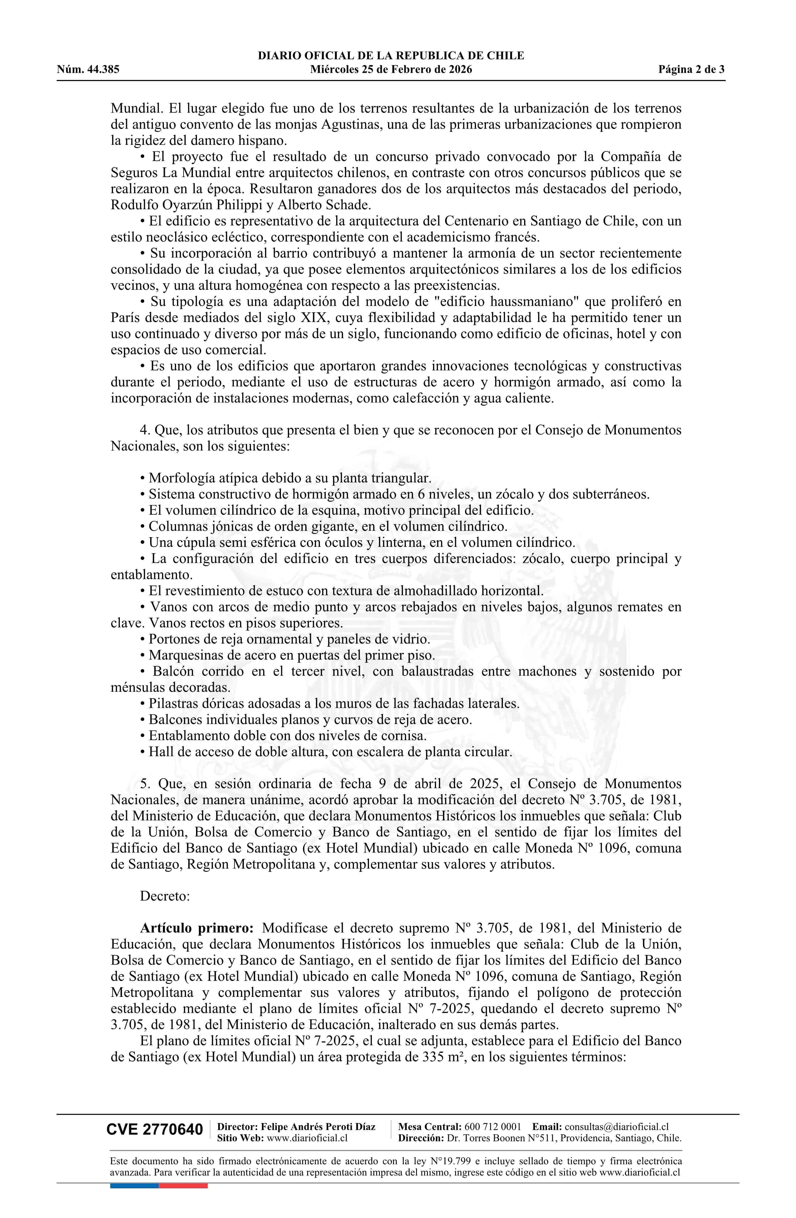 Título: Decreto exento número 16, de 2026.- Modifica decreto Nº 3.705, de 1981, del Ministerio de Educación, que declara Monumentos Históricos los inmuebles Club de la Unión, Bolsa de Comercio y Banco de Santiago