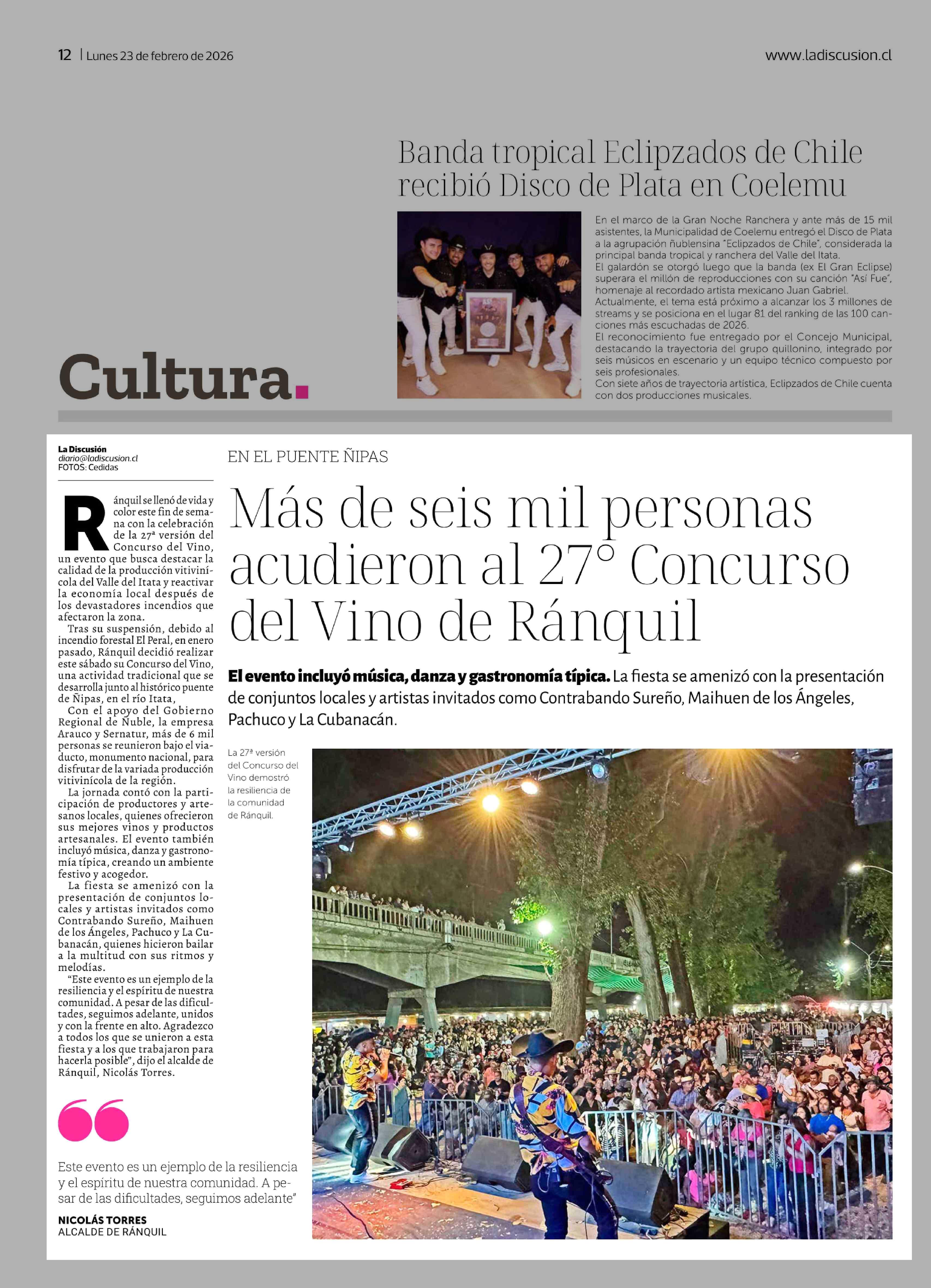 Más de seis mil personas acudieron al 27º Concurso del Vino de Ránquil 23-02-2026 La Discusión |