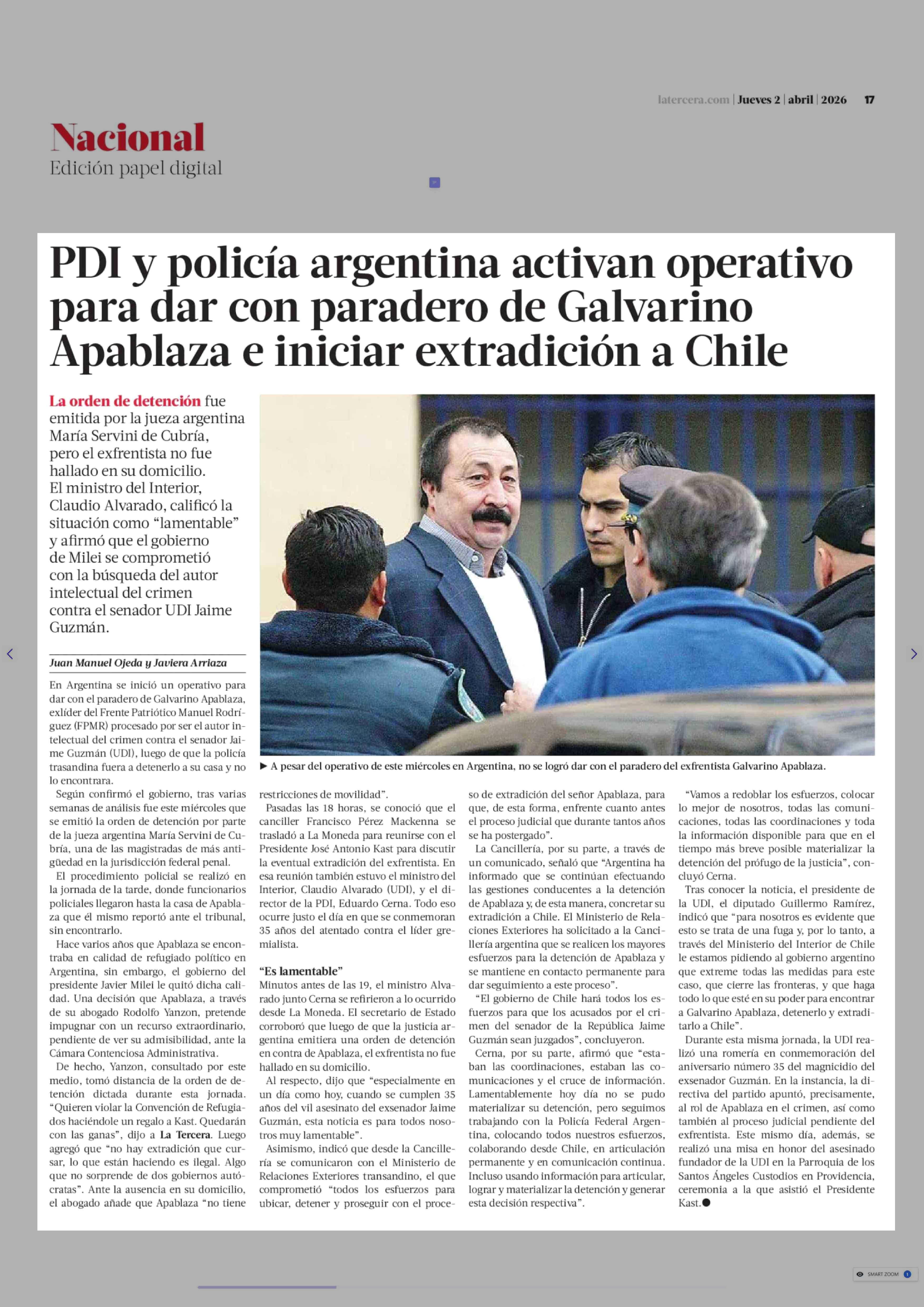 Título: PDI y policía argentina activan operativo para dar con paradero de Galvarino Apablaza e iniciar extradición a Chile