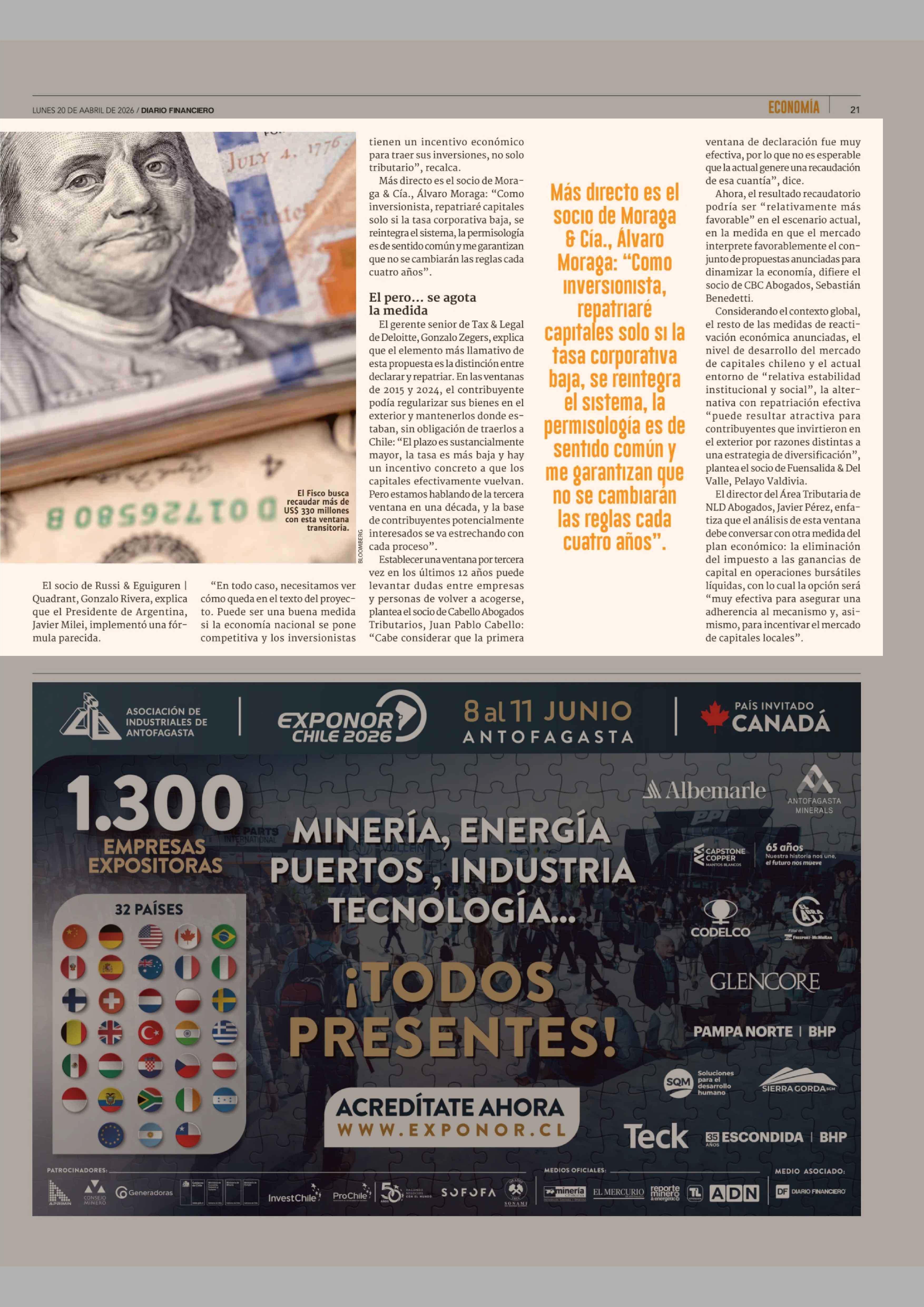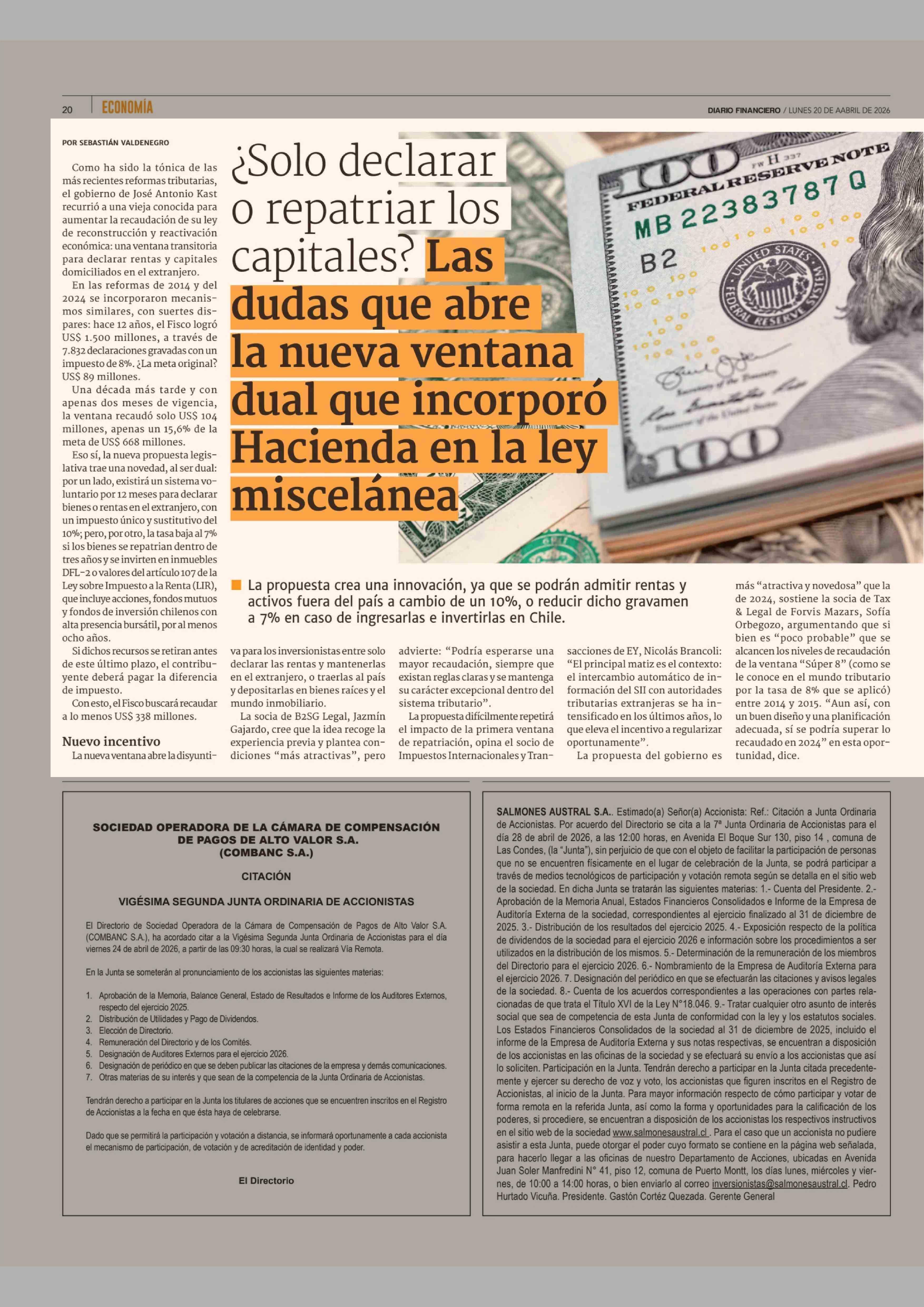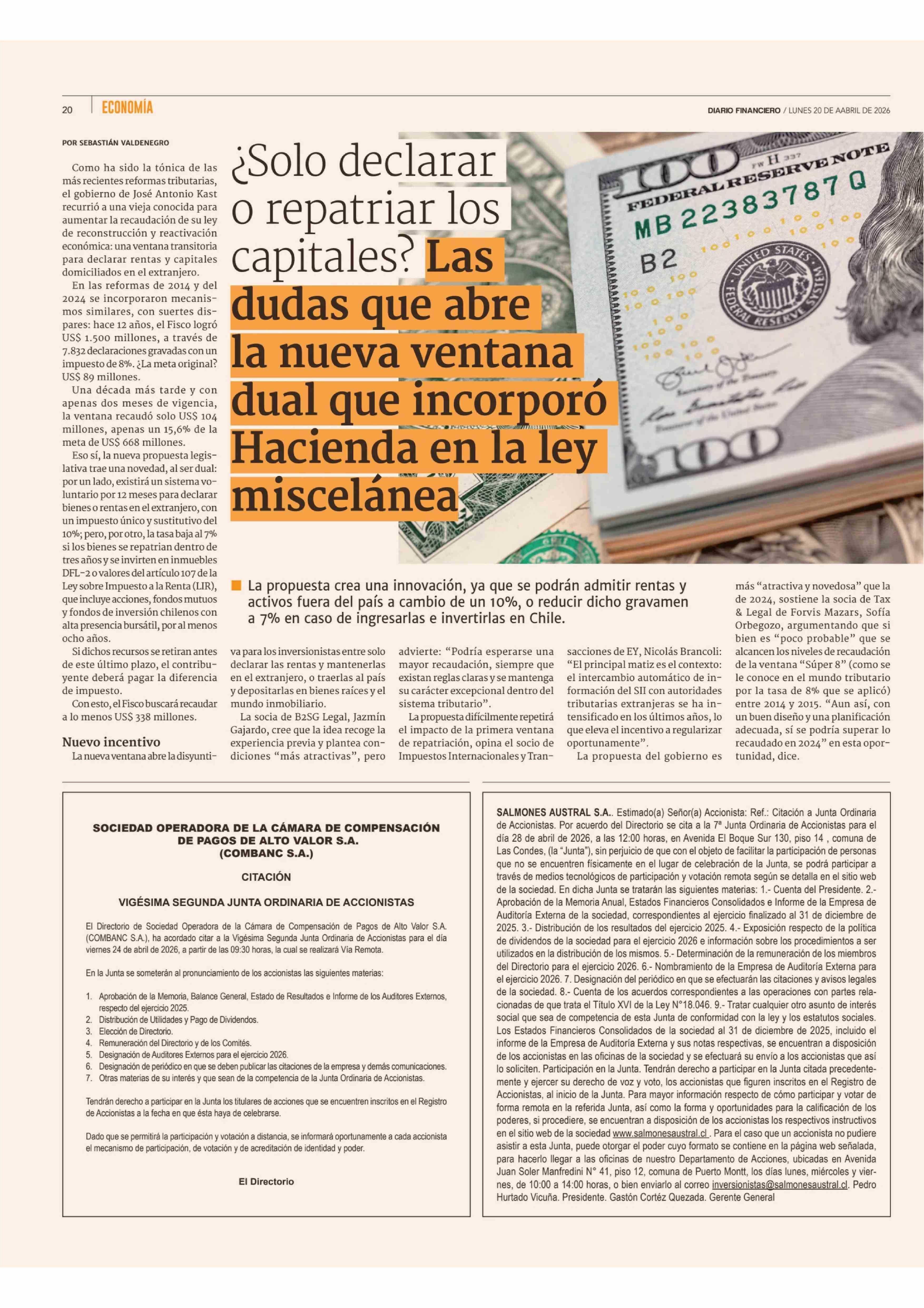¿Solo declarar o repatriar los capitales? Las dudas que abre la nueva ventana dual que incorporó Hacienda en la ley miscelánea 20-04-2026 Diario Financiero |