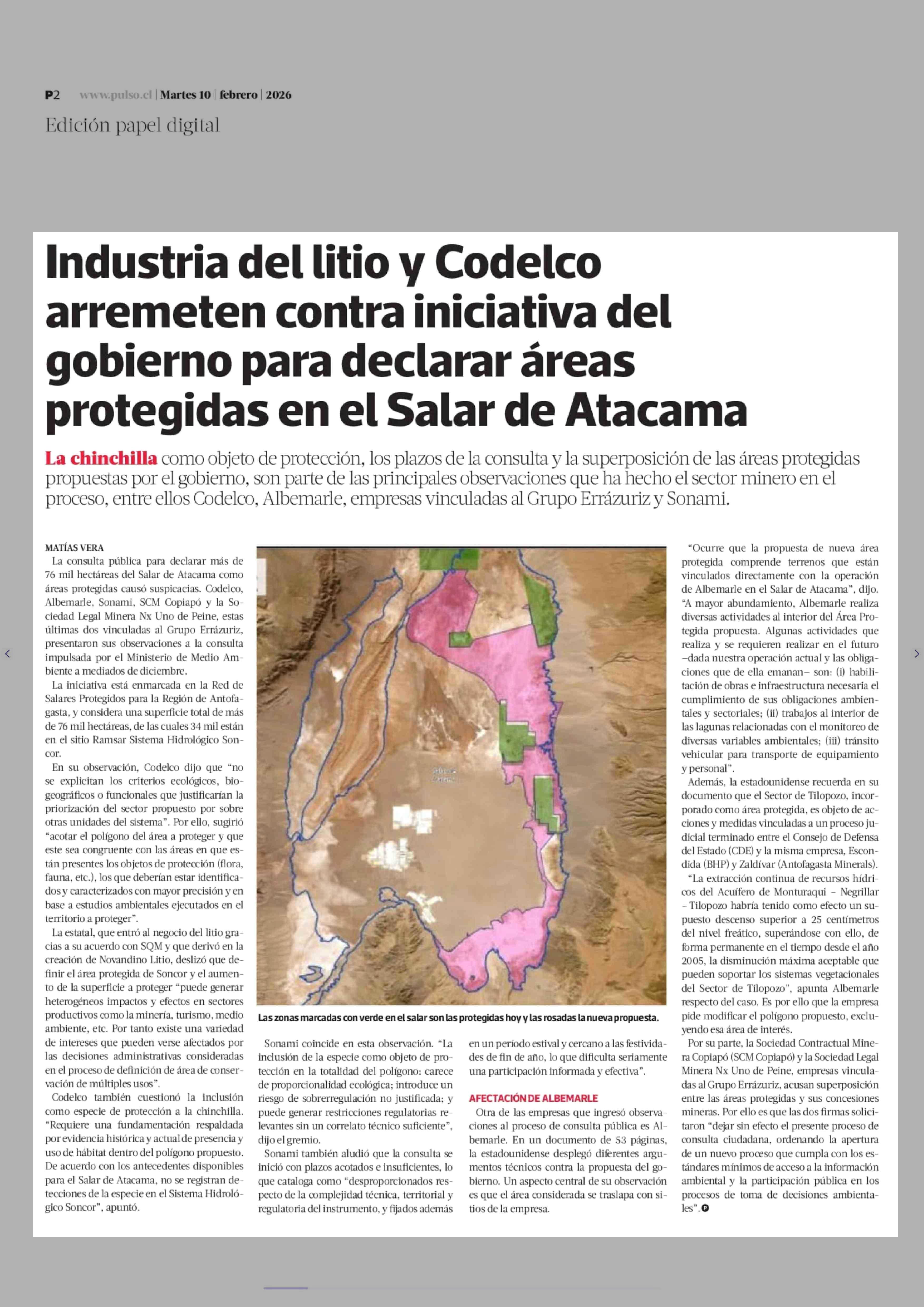 Título: Industria del litio y Codelco arremeten contra iniciativa del gobierno para declarar áreas protegidas en el Salar de Atacama