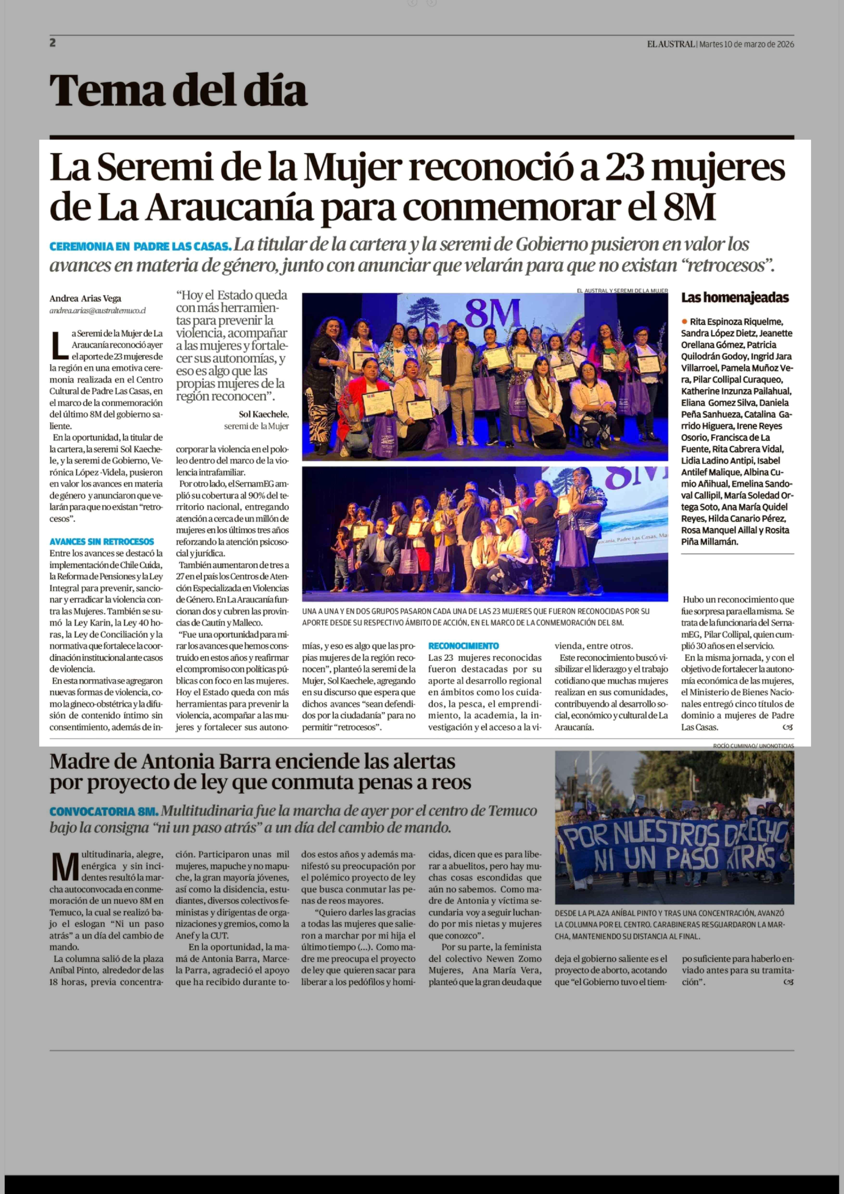 La Seremi de la Mujer reconoció a 23 mujeres de La Araucanía para conmemorar el 8M 10-03-2026 El Austral de la Araucanía |