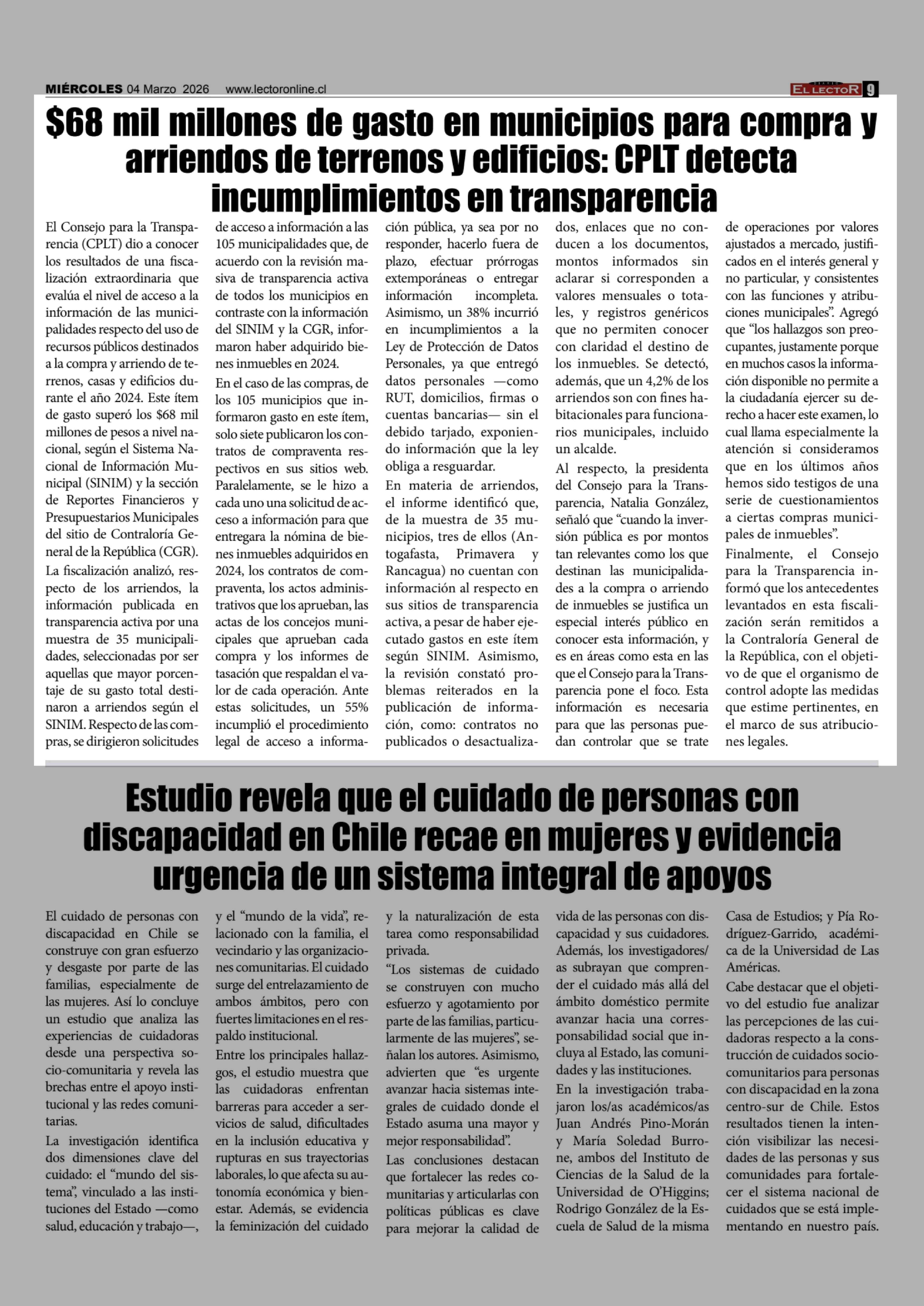 $68 Mil millones de gasto en municipios para compra y arriendos de terrenos y edificios: CPLT detecta incumplimientos en transparencia 05-03-2026 El Lector |