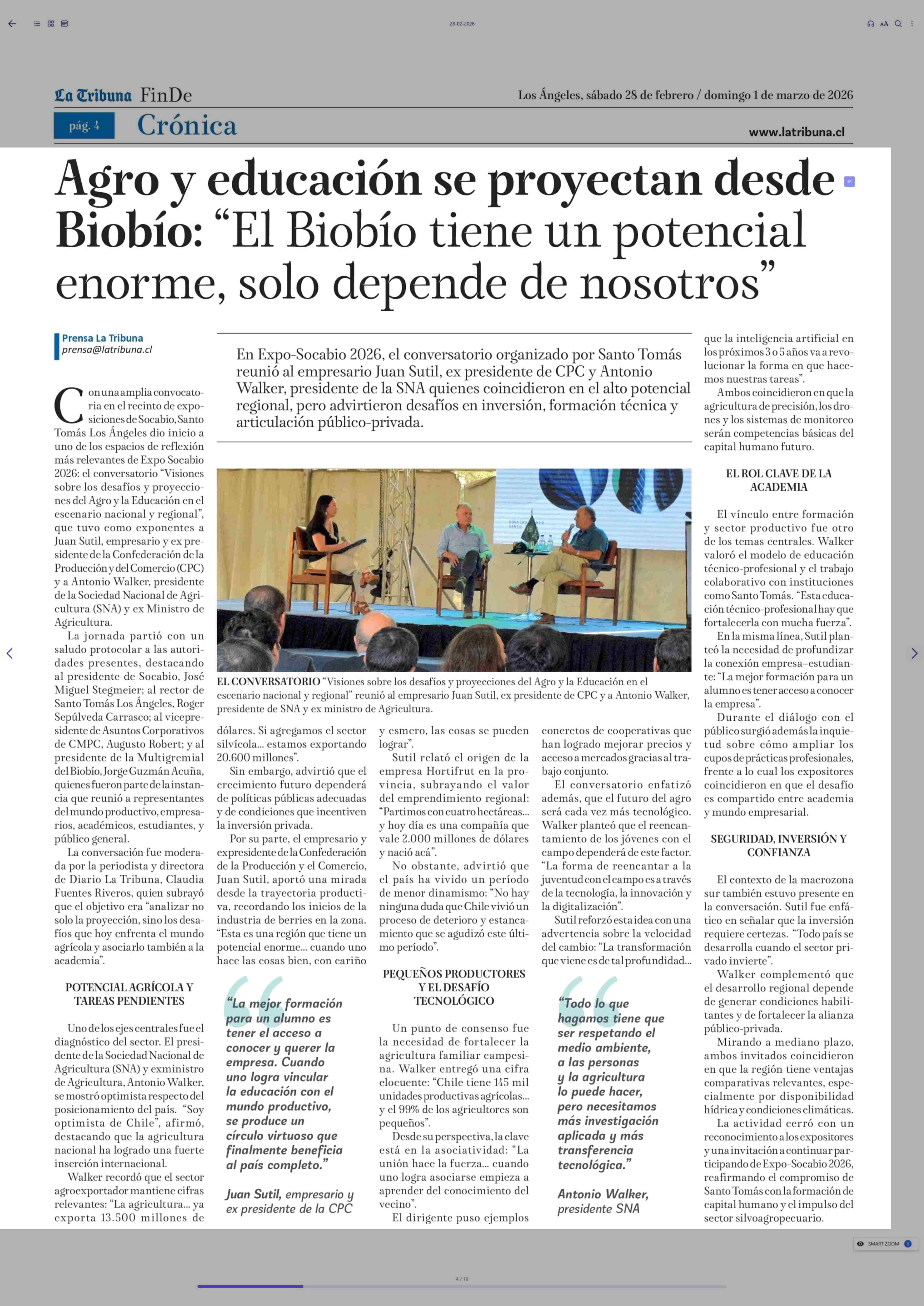 Agro y educación se proyectan desde. Biobío: “El Biobío tiene un potencial enorme, solo depende de nosotros” 28-02-2026 La Tribuna |