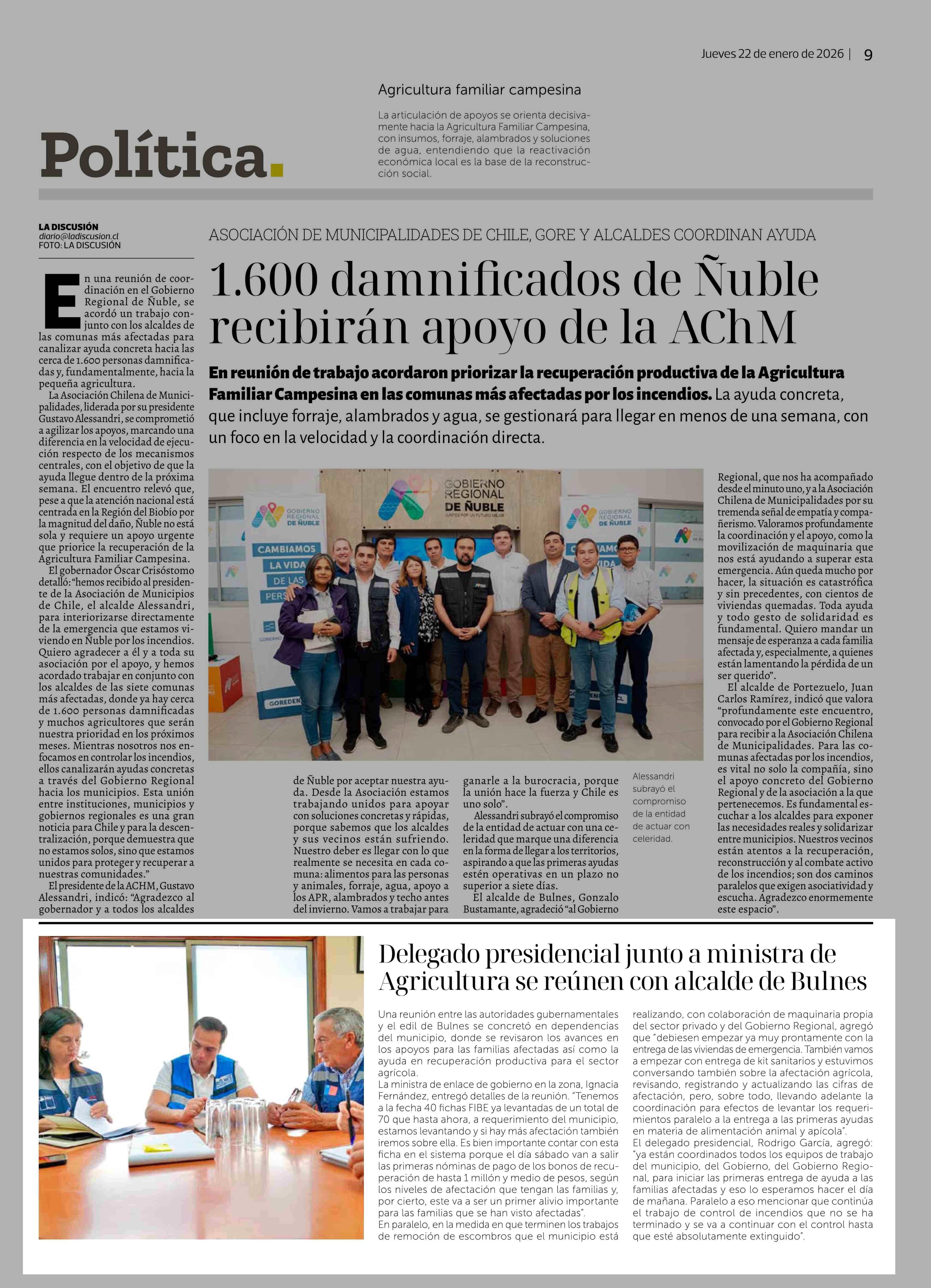 Delegado presidencial junto a ministra de Agricultura se reúnen con alcalde de Bulnes 22-01-2026 La Discusión |