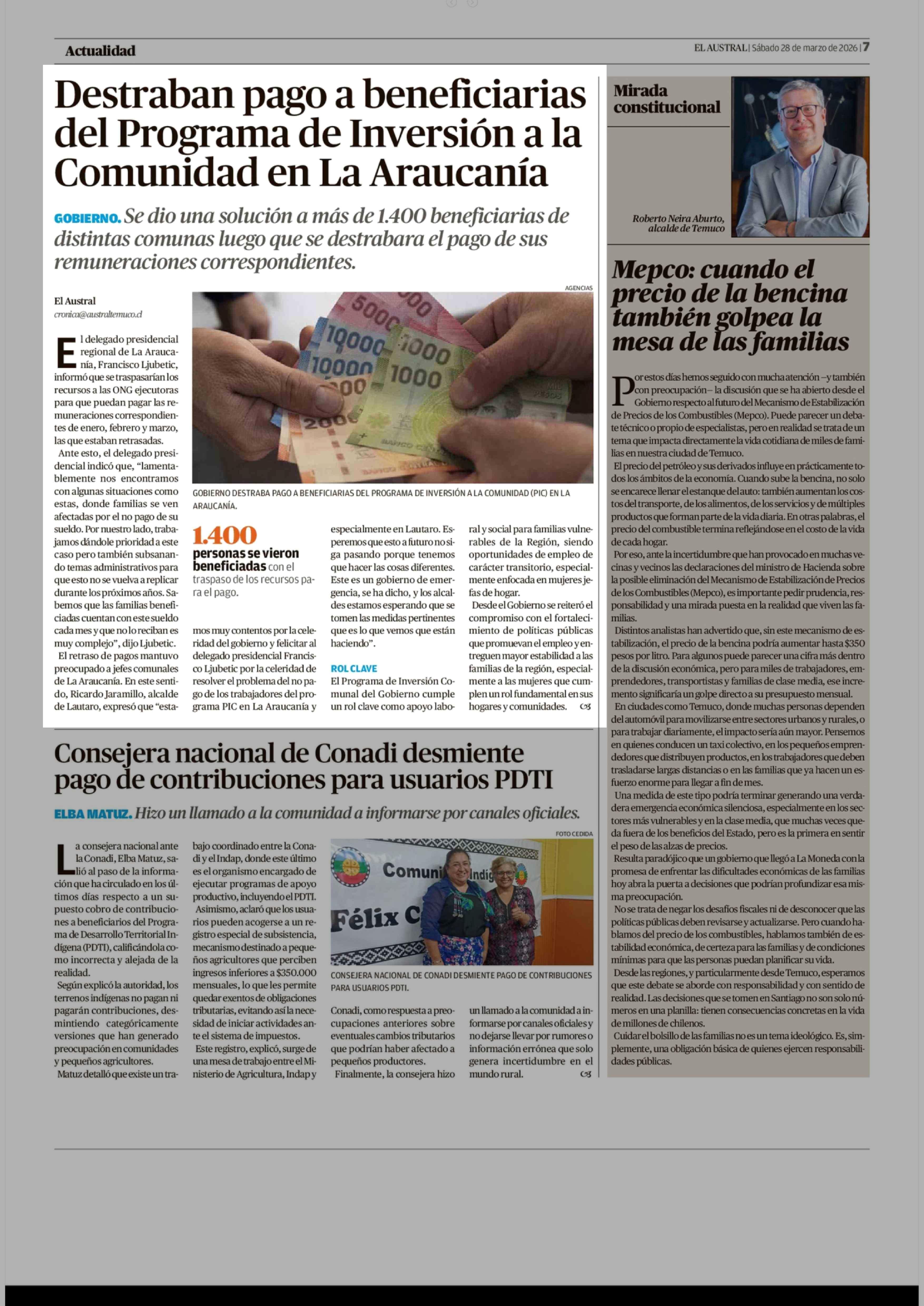 Destraban pago a beneficiarias del Programa de Inversión a la Comunidad en La Araucanía 28-03-2026 El Austral de la Araucanía |