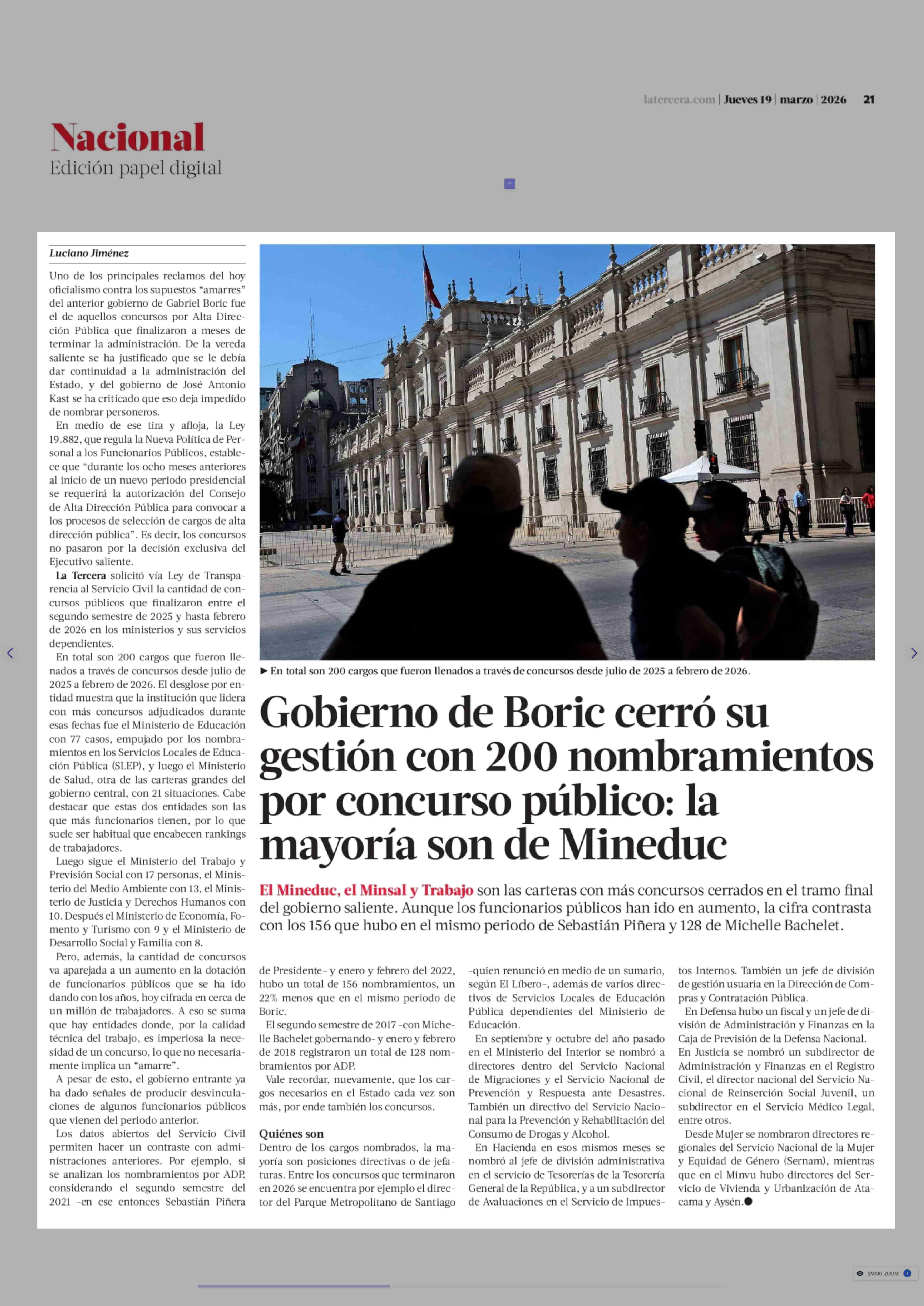 Gobierno de Boric cerró su gestión con 200 nombramientos por concurso público: la mayoría son de Mineduc 19-03-2026 La Tercera |
