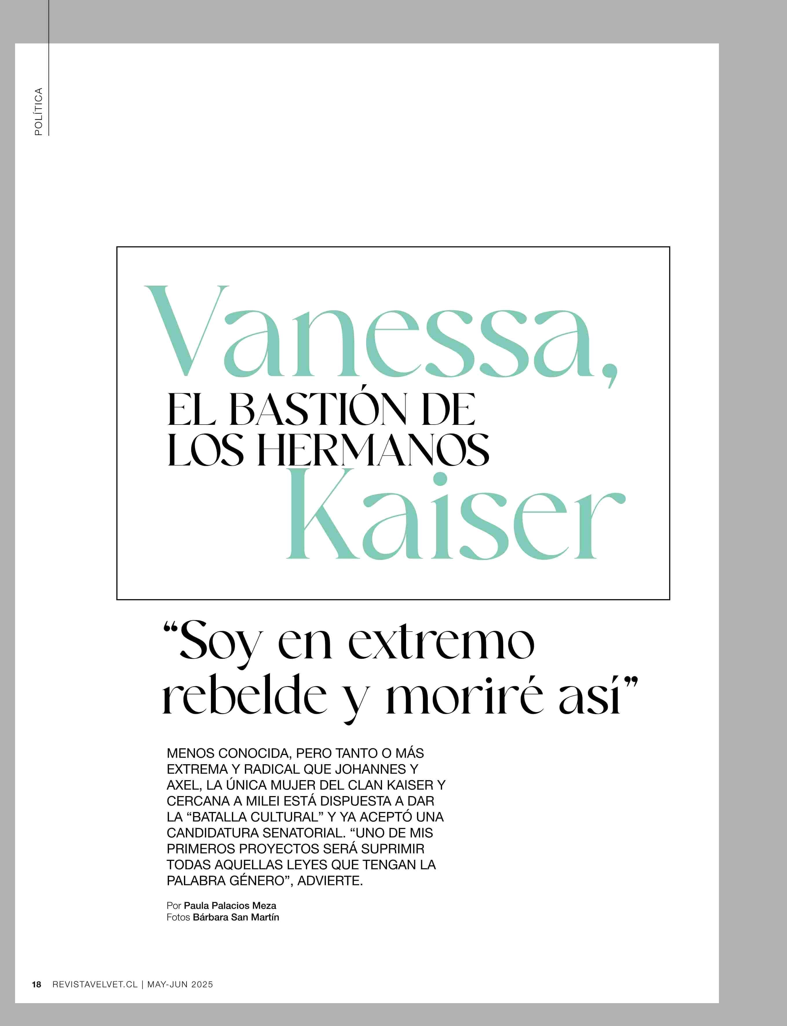 Vanessa EL BASTIÓN DE LOS HERMANOS Kaiser “Soy en extremo rebelde y moriré así" 26-05-2025 Revista Velvet |