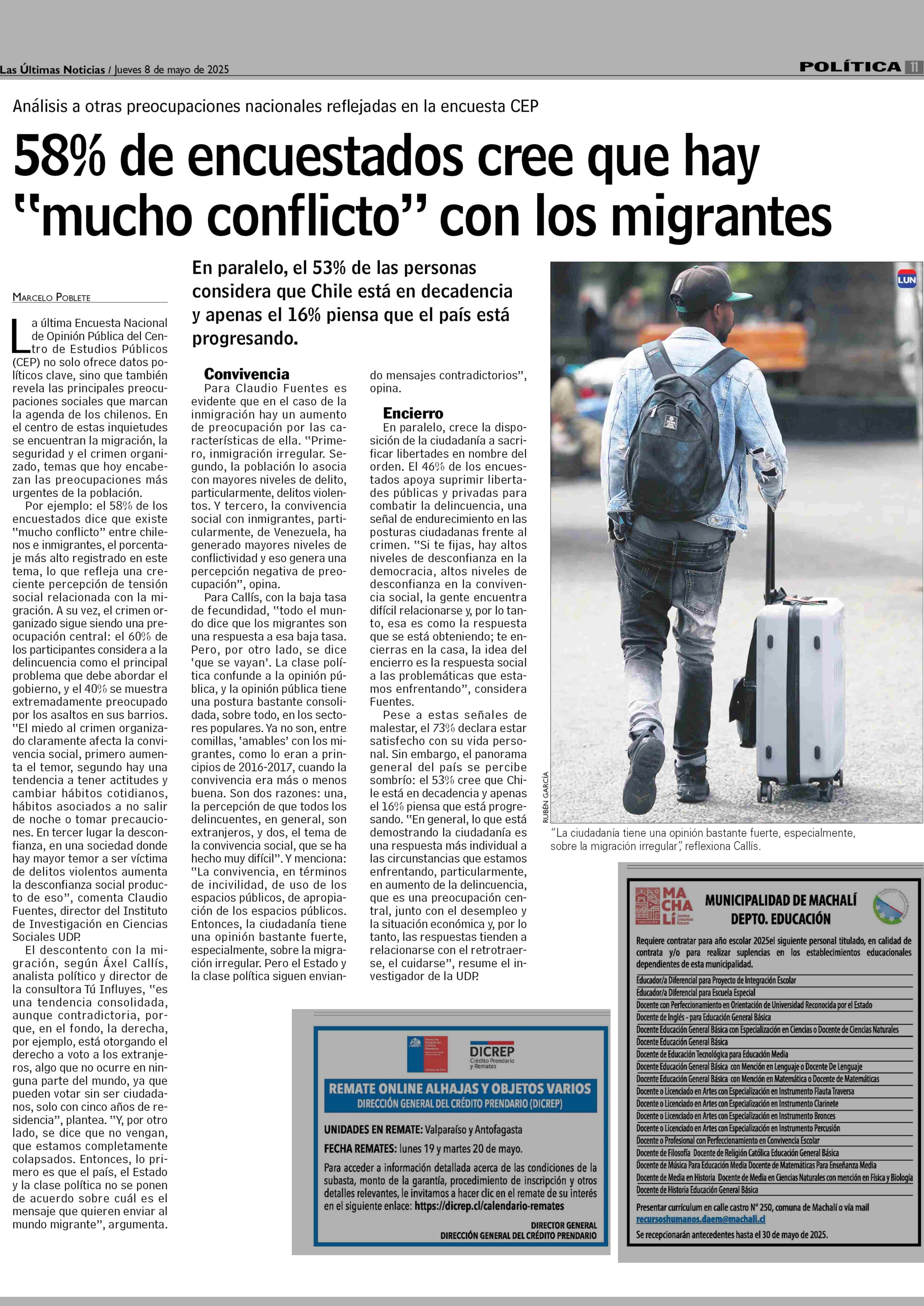58% de encuestados cree que hay "mucho conflicto" con los migrantes 08-05-2025 Las Últimas Noticias |