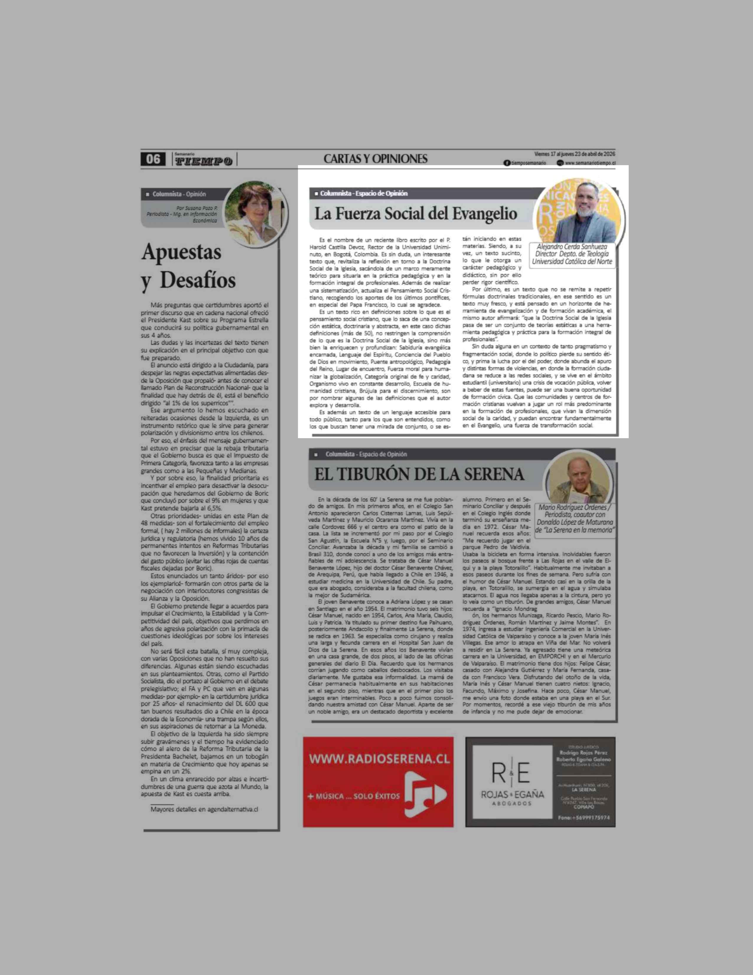 Columnas de Opinión: La Fuerza Social del Evangelio 17-04-2026 Semanario Tiempo |