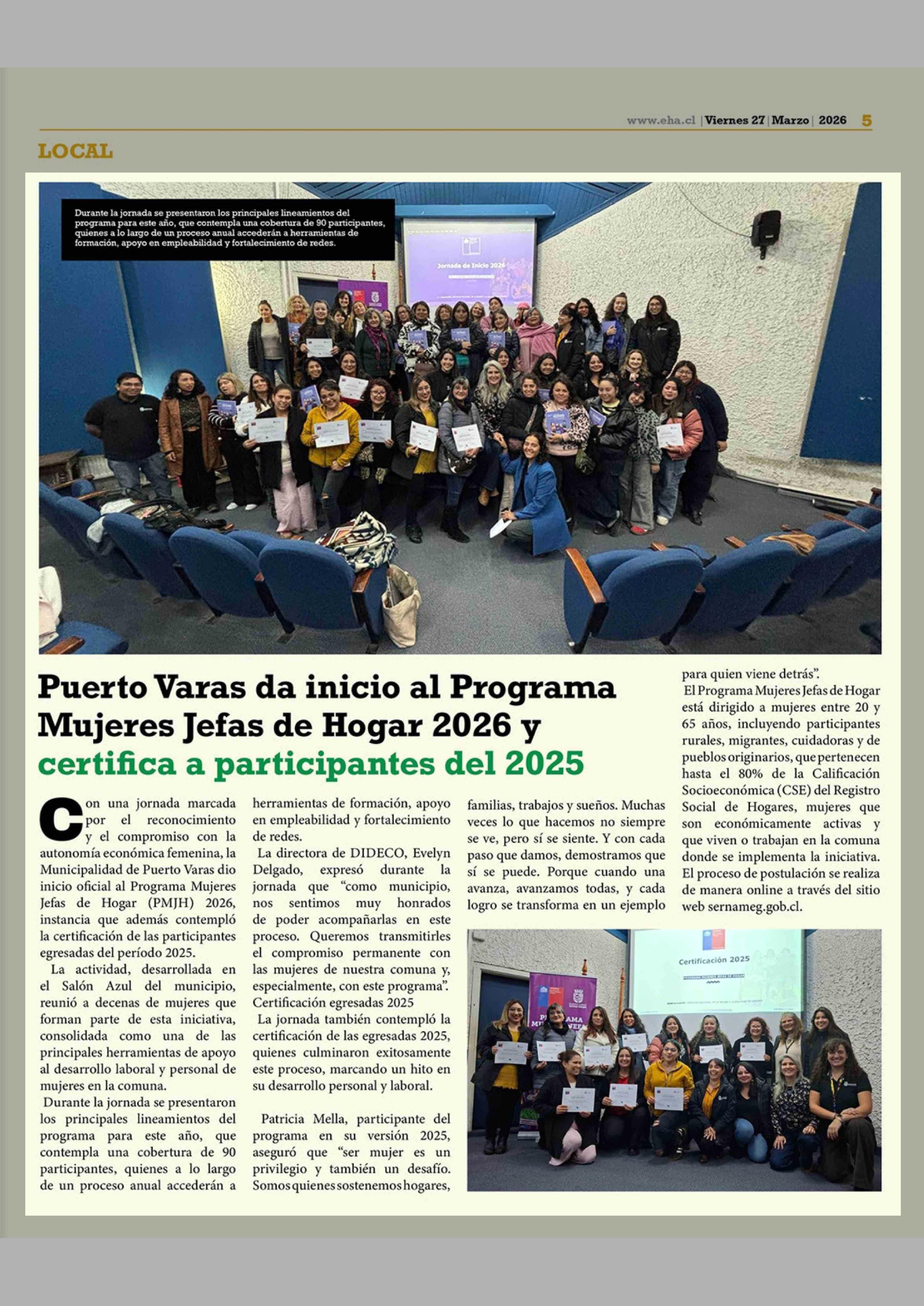 Puerto Varas da inicio al Programa Mujeres Jefas de Hogar 2026 y certifica a participantes del 2025 27-03-2026 El Heraldo Austral |