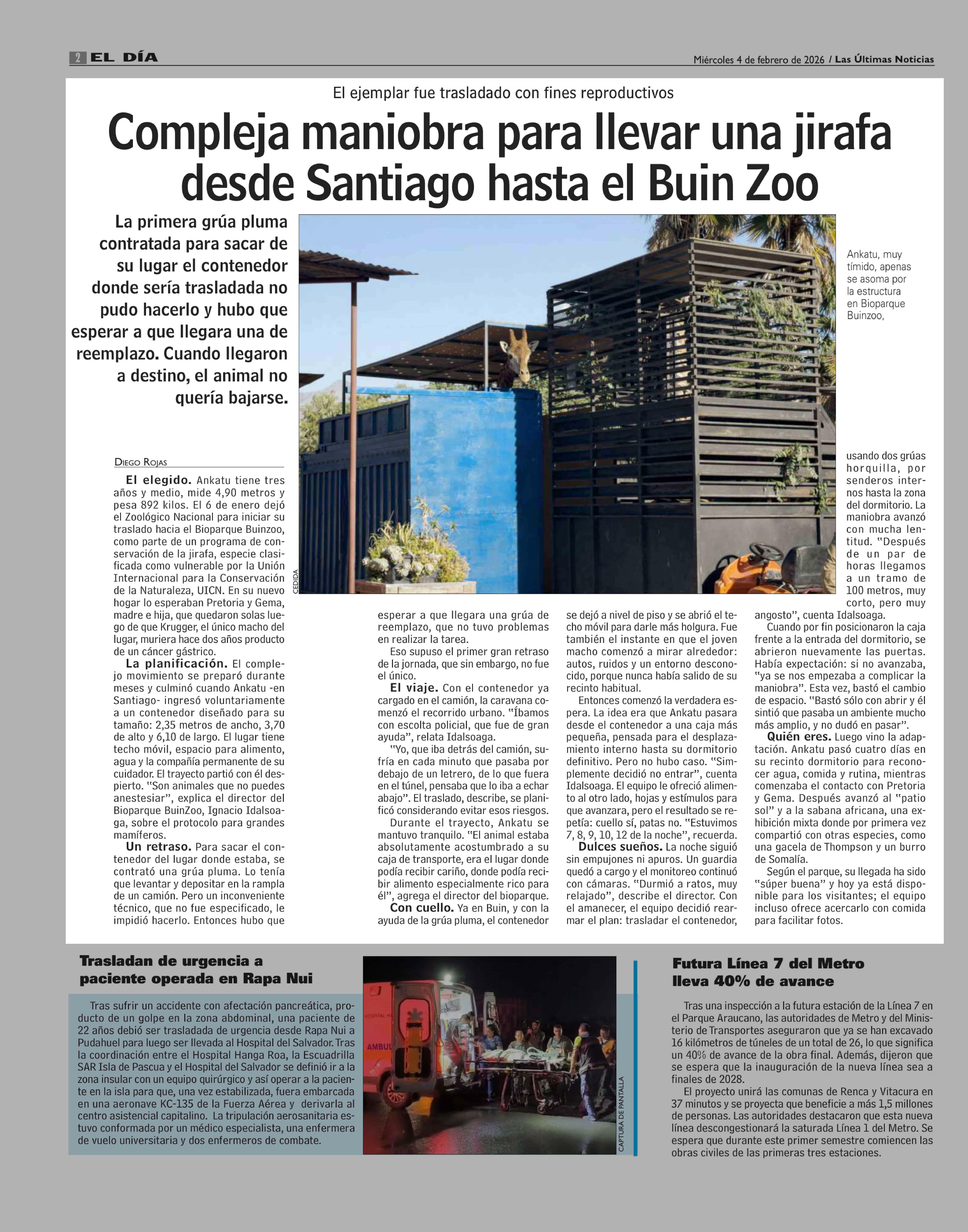 Compleja maniobra para llevar una jirafa desde Santiago hasta el Buin Zoo 04-02-2026 Las Últimas Noticias |