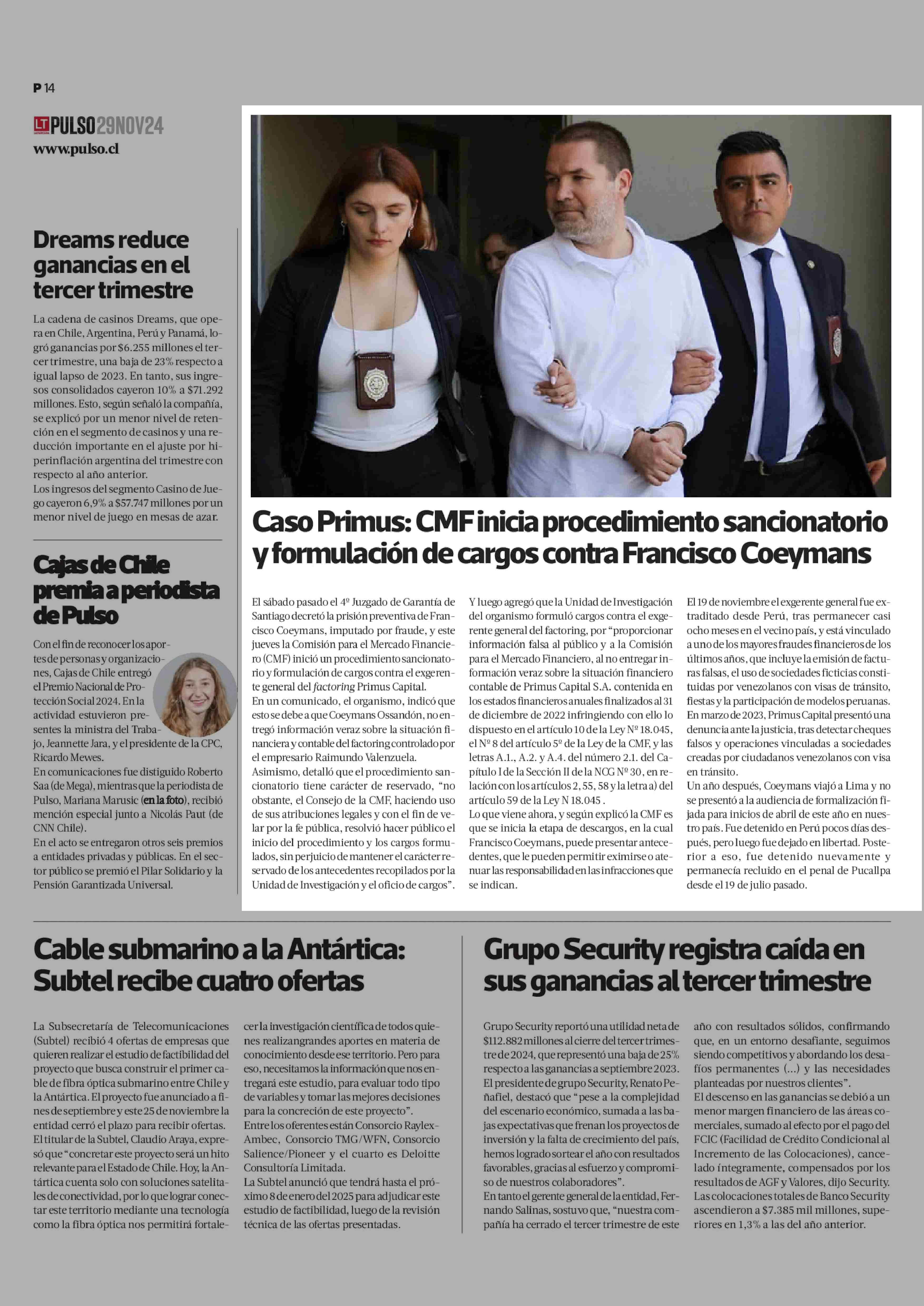 Caso Primus: CMPF inicia procedimiento sancionatorio y formulación de cargos contra Francisco Coeymans 29-11-2024 La Tercera |