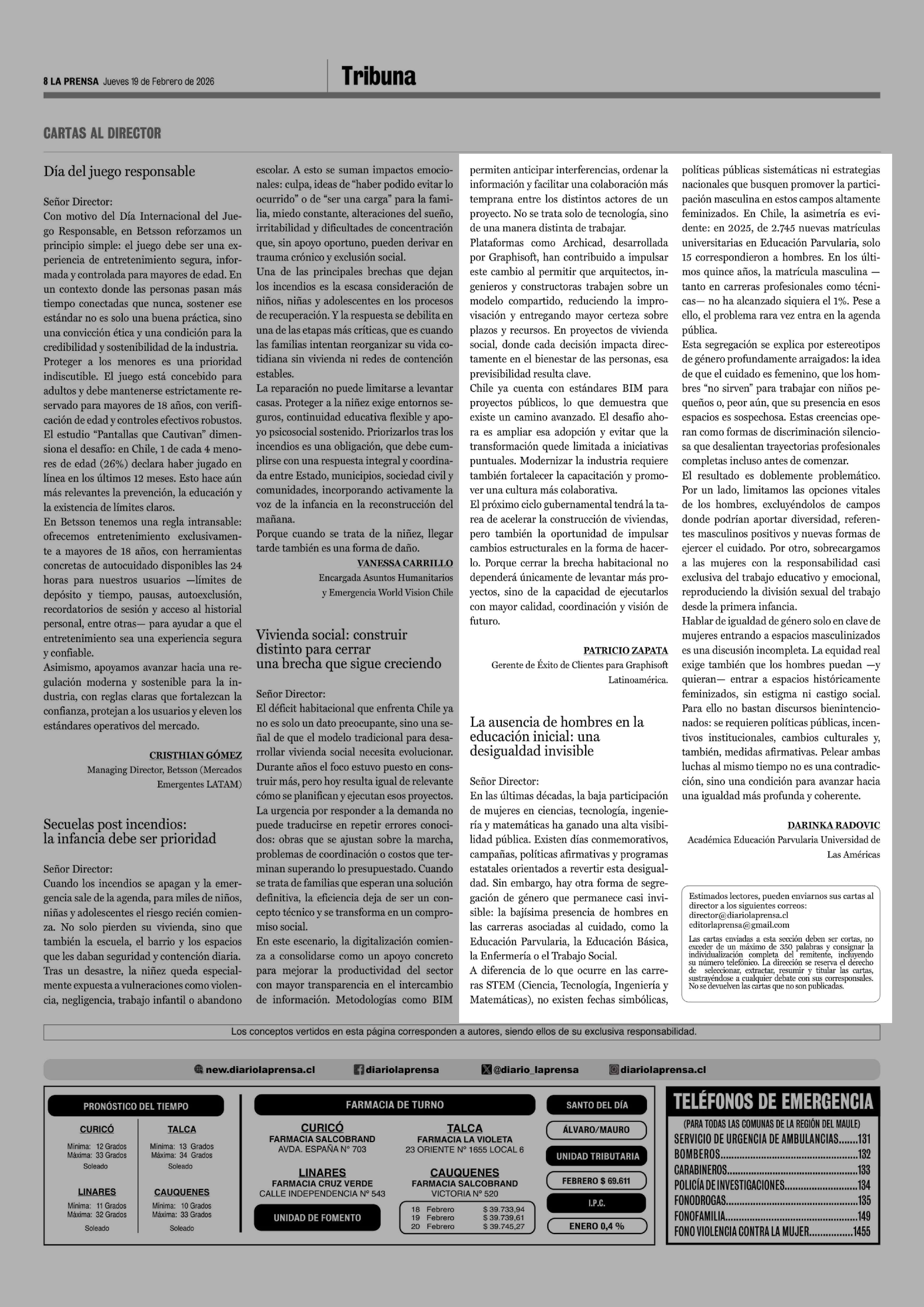 Cartas: La ausencia de hombres en la educación inicial: una desigualdad invisible 19-02-2026 La Prensa de Curicó |