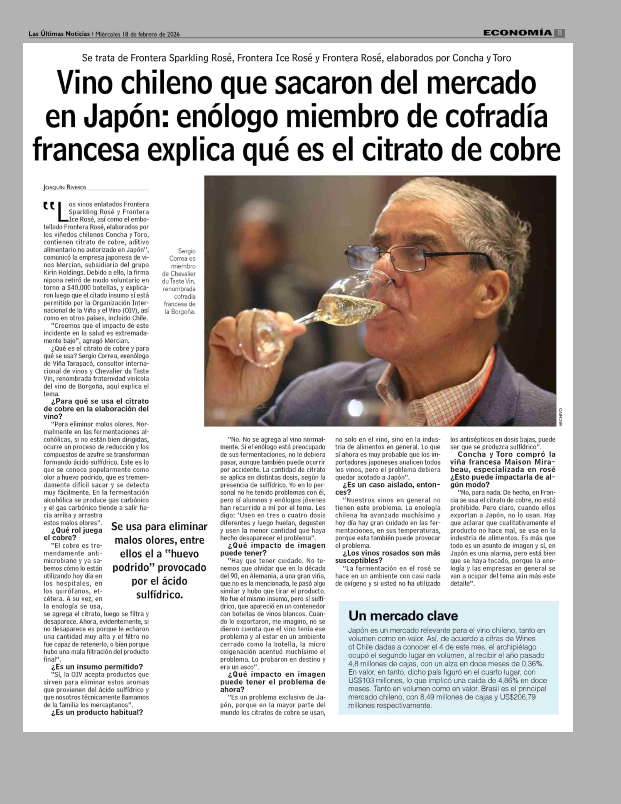 Vino chileno que sacaron del mercado en Japón: enólogo miembro de cofradía francesa explica qué es el citrato de cobre 18-02-2026 Las Últimas Noticias |