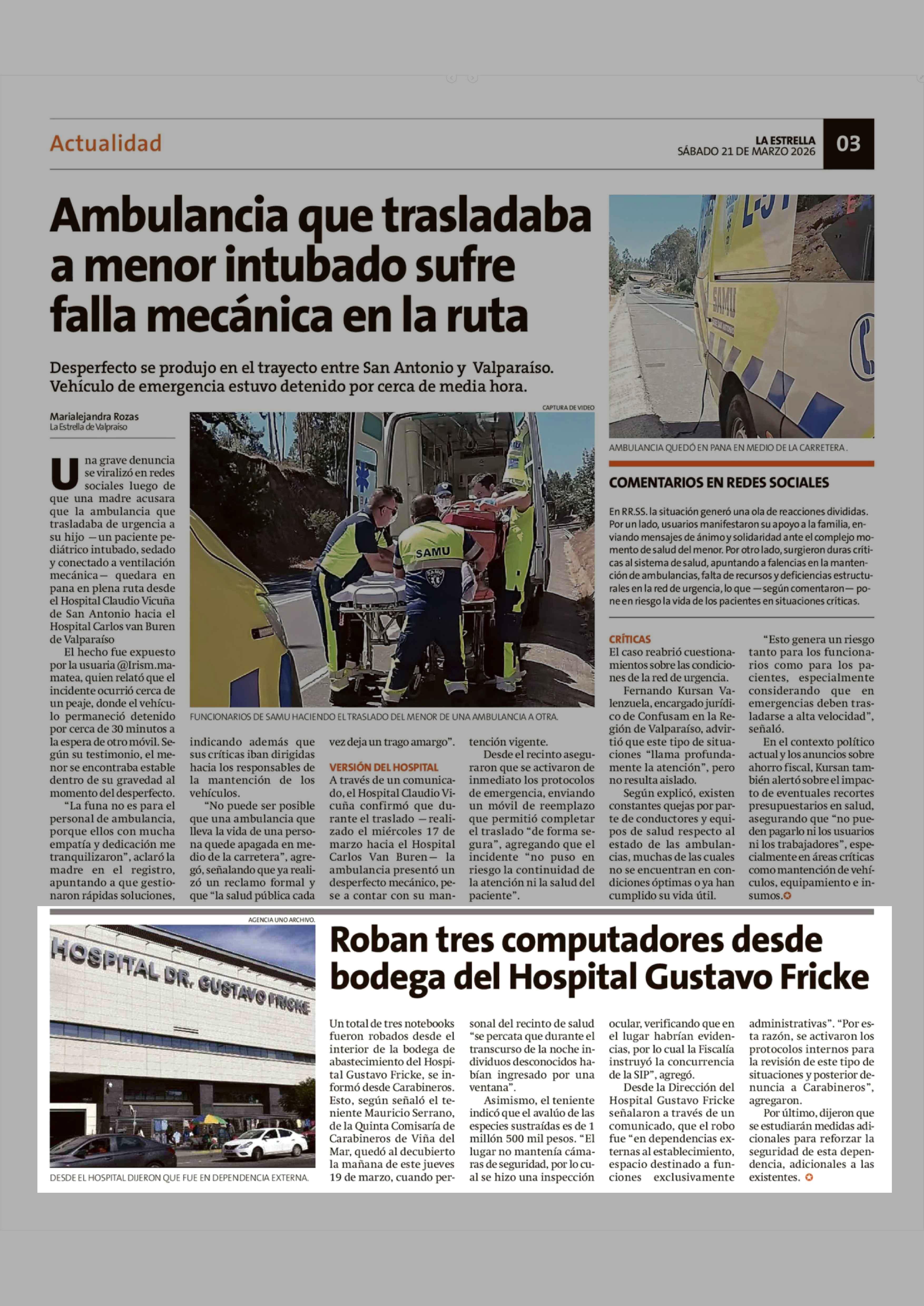 Roban tres computadores desde bodega del Hospital Gustavo Fricke 21-03-2026 La Estrella de Valparaíso |