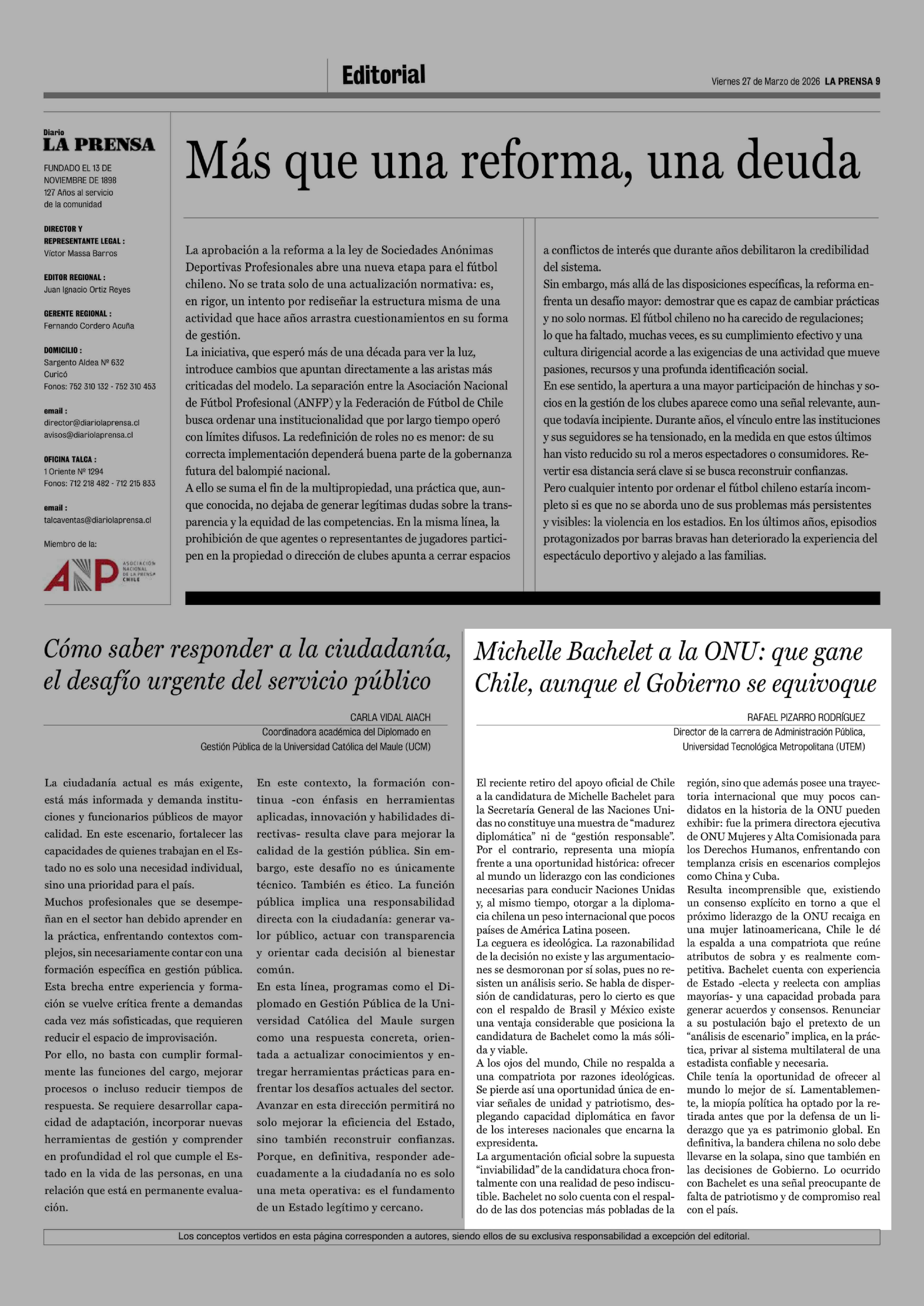 Columnas de Opinión: Michelle Bachelet a la ONU: que gane Chile, aunque el Gobierno se equivoque 27-03-2026 La Prensa de Curicó |