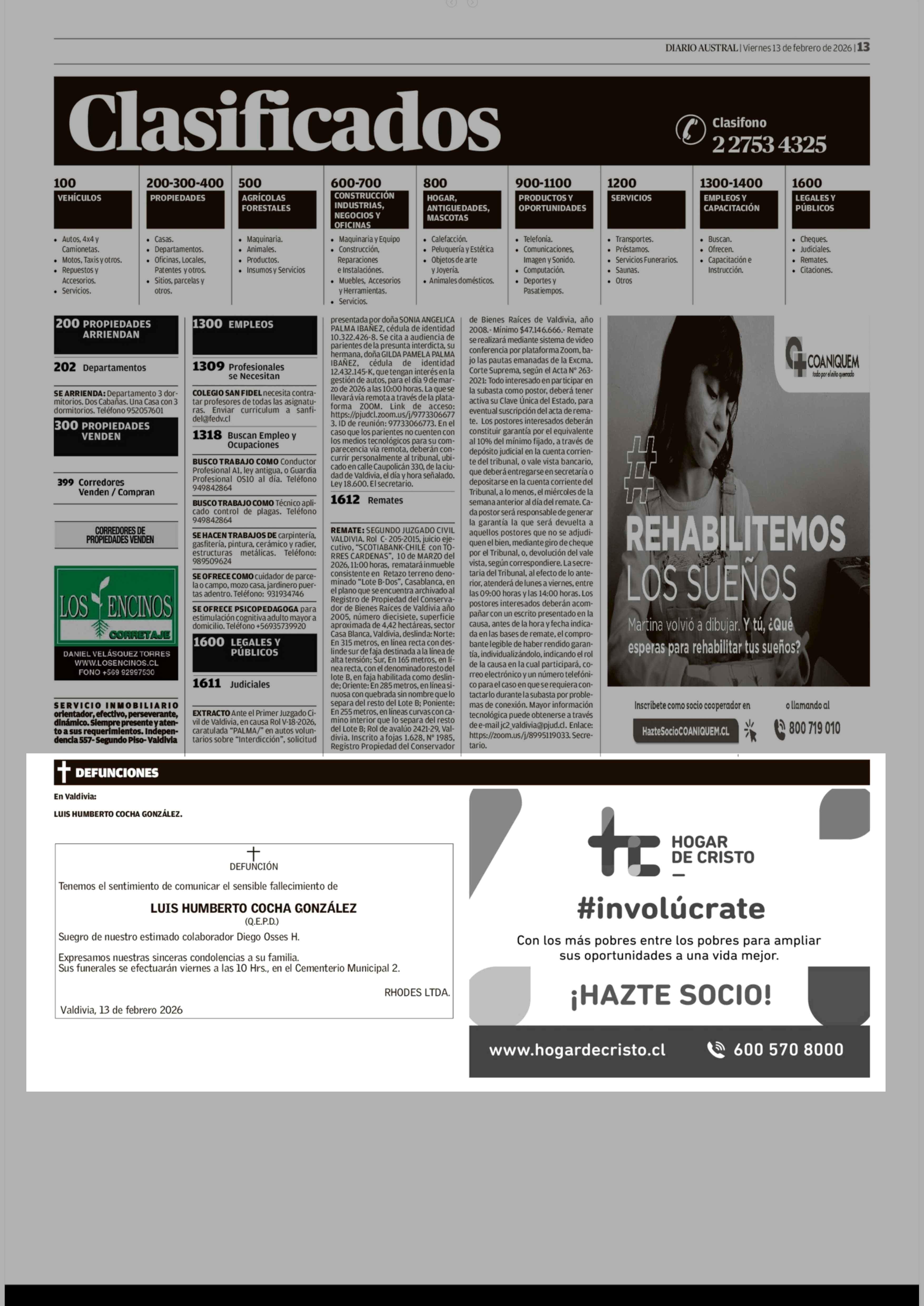 OBITUARIO: defunciones 13-02-2026 Diario Austral Región de Los Ríos |