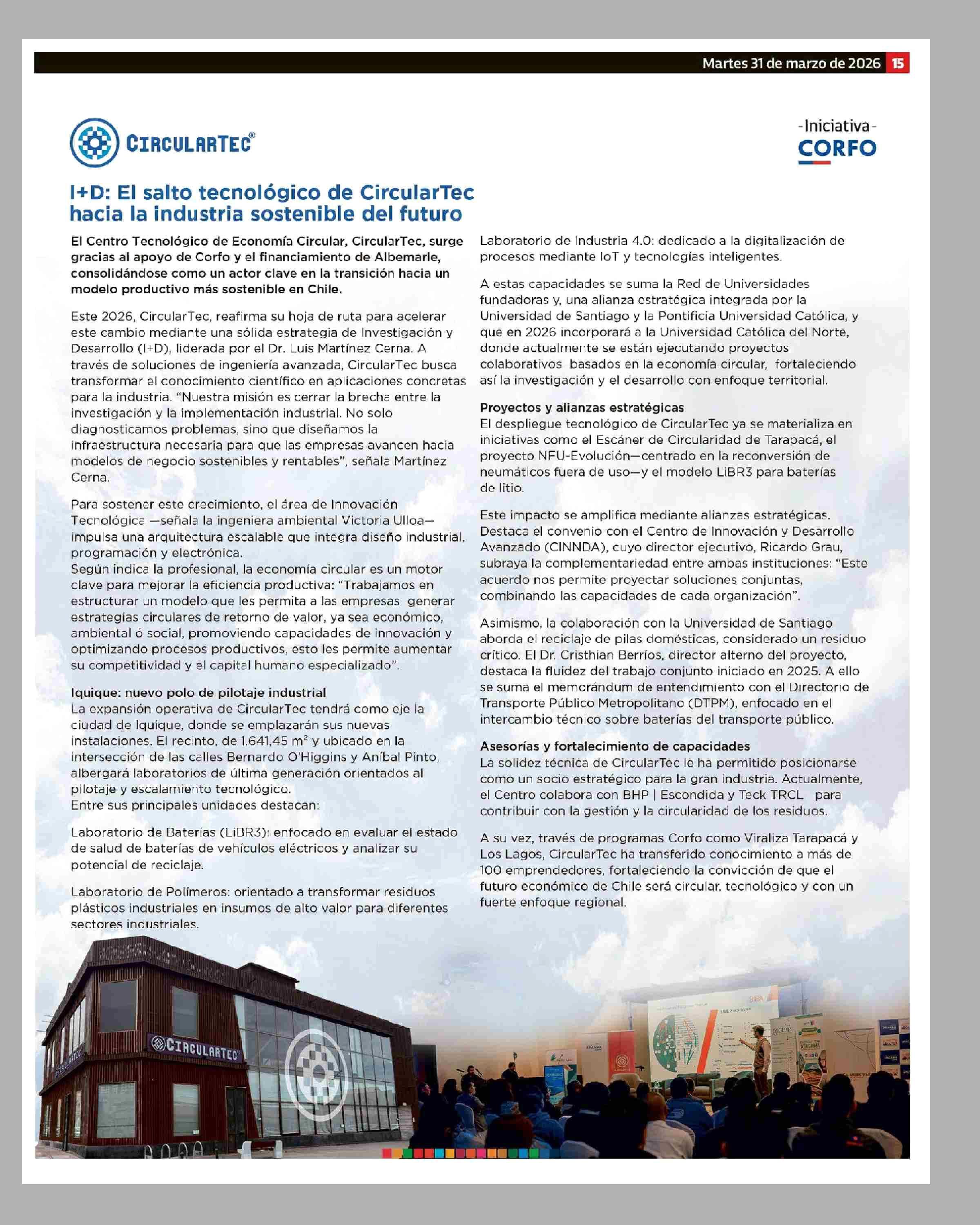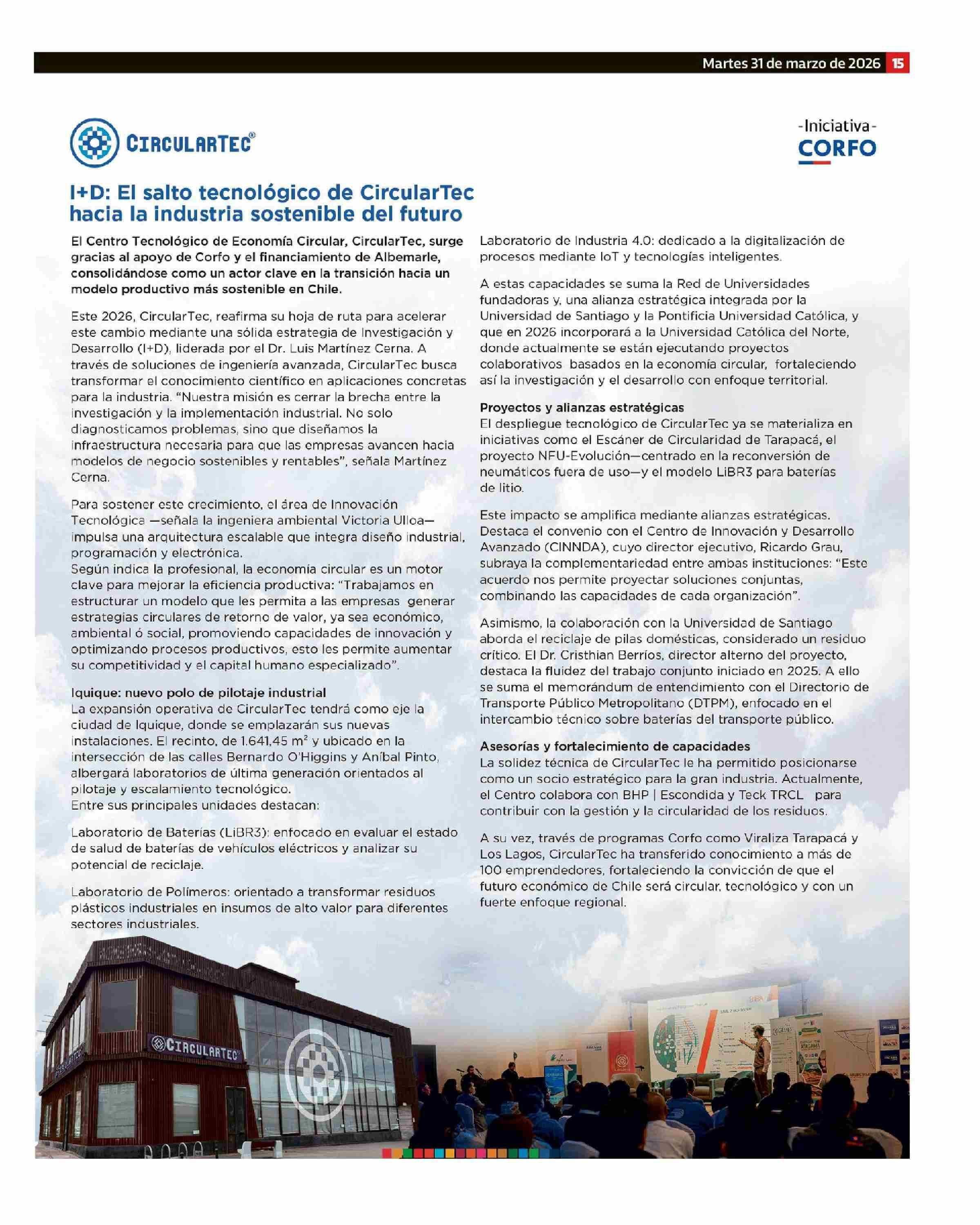 I+D: El salto tecnológico de CircularTec hacia la industria sostenible del futuro 31-03-2026 Diario Austral Región de Los Ríos |