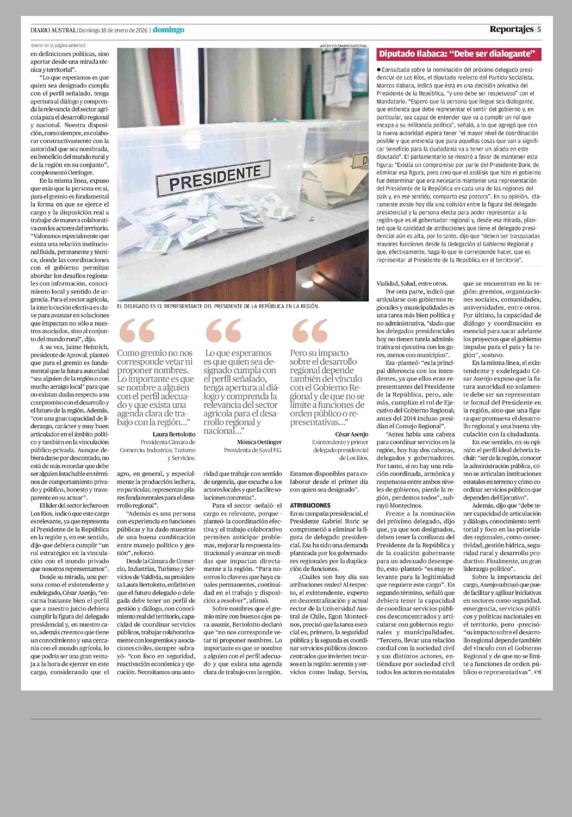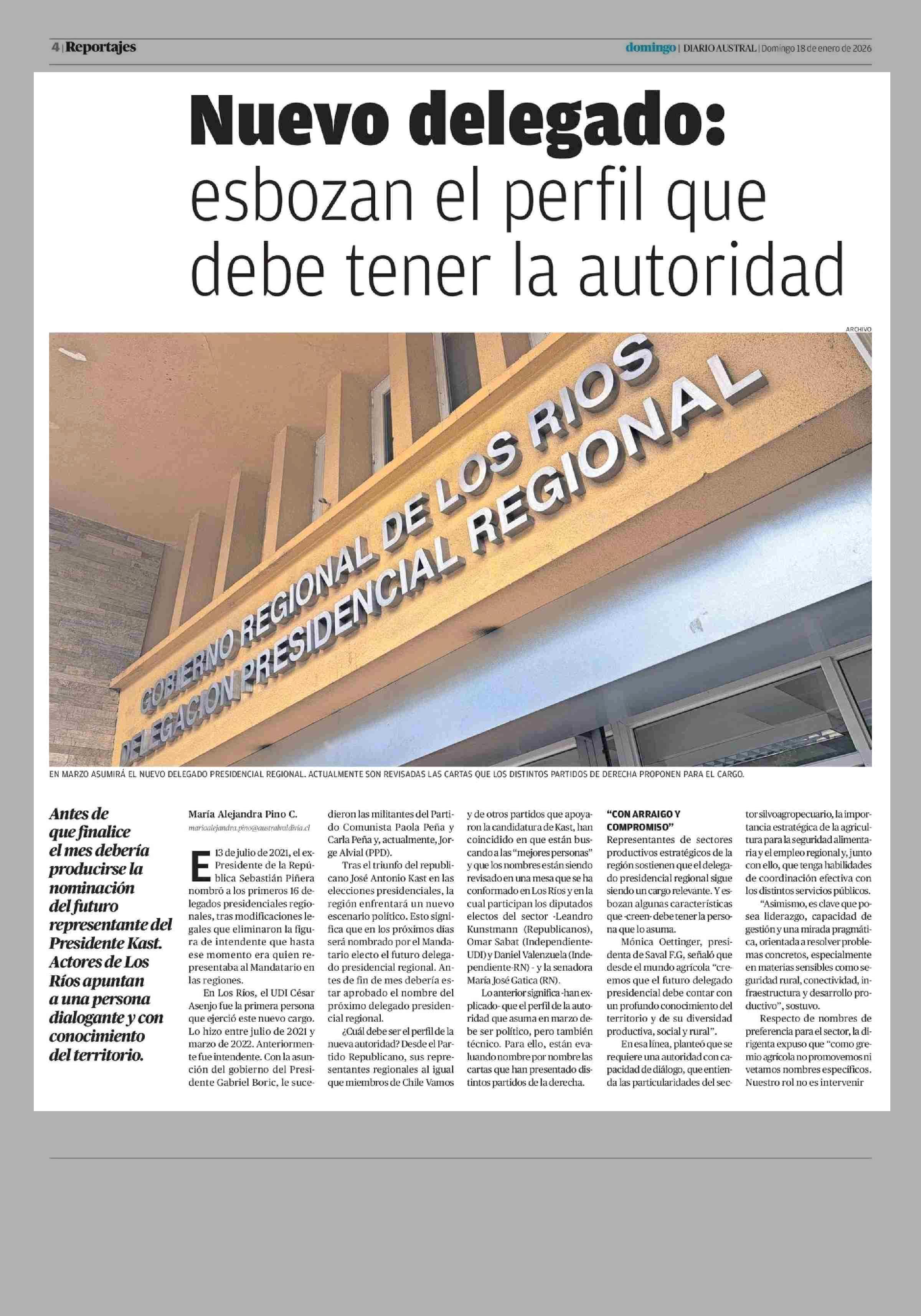 Nuevo delegado: esbozan el perfil que debe tener la autoridad 18-01-2026 Diario Austral Región de Los Ríos |