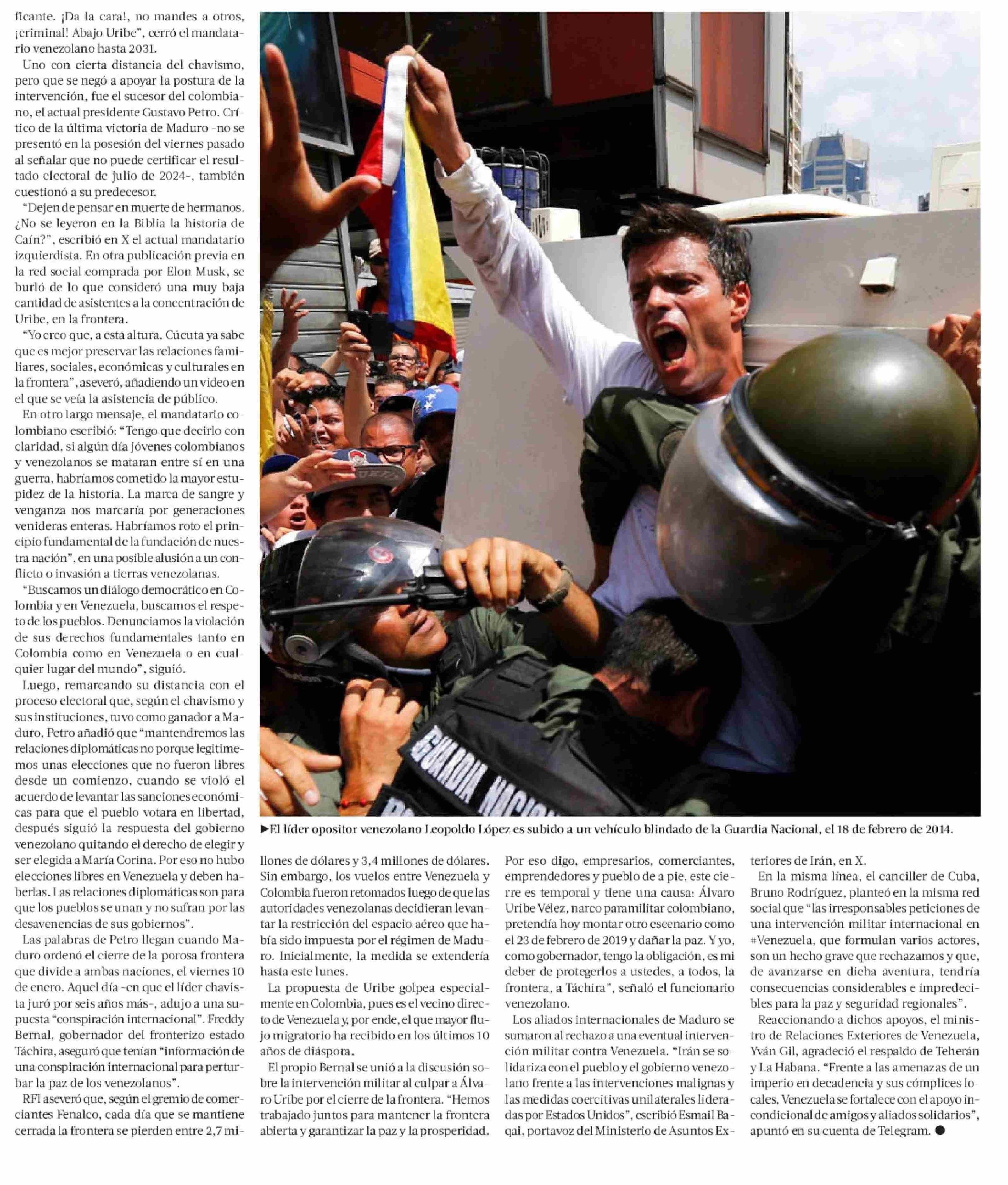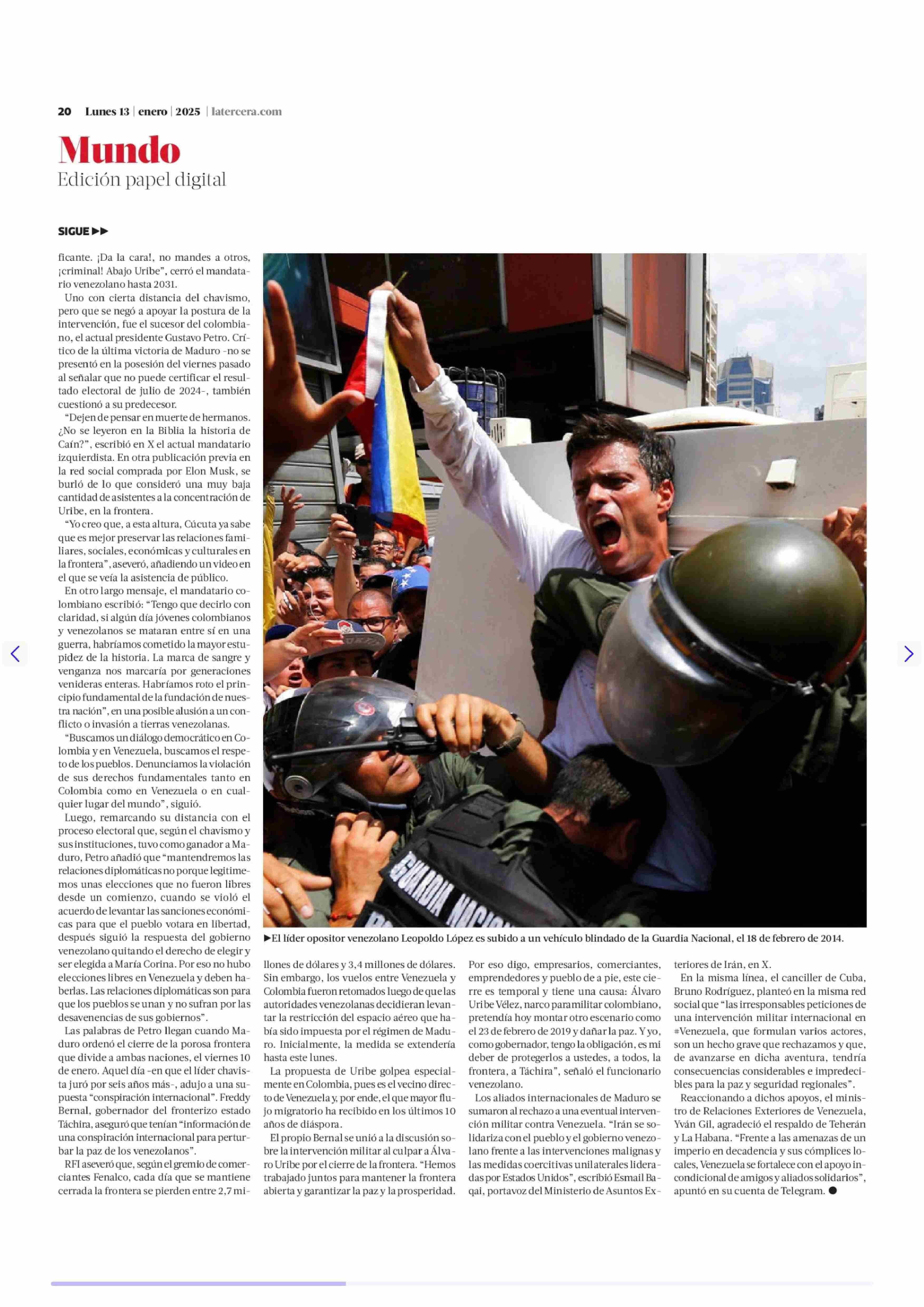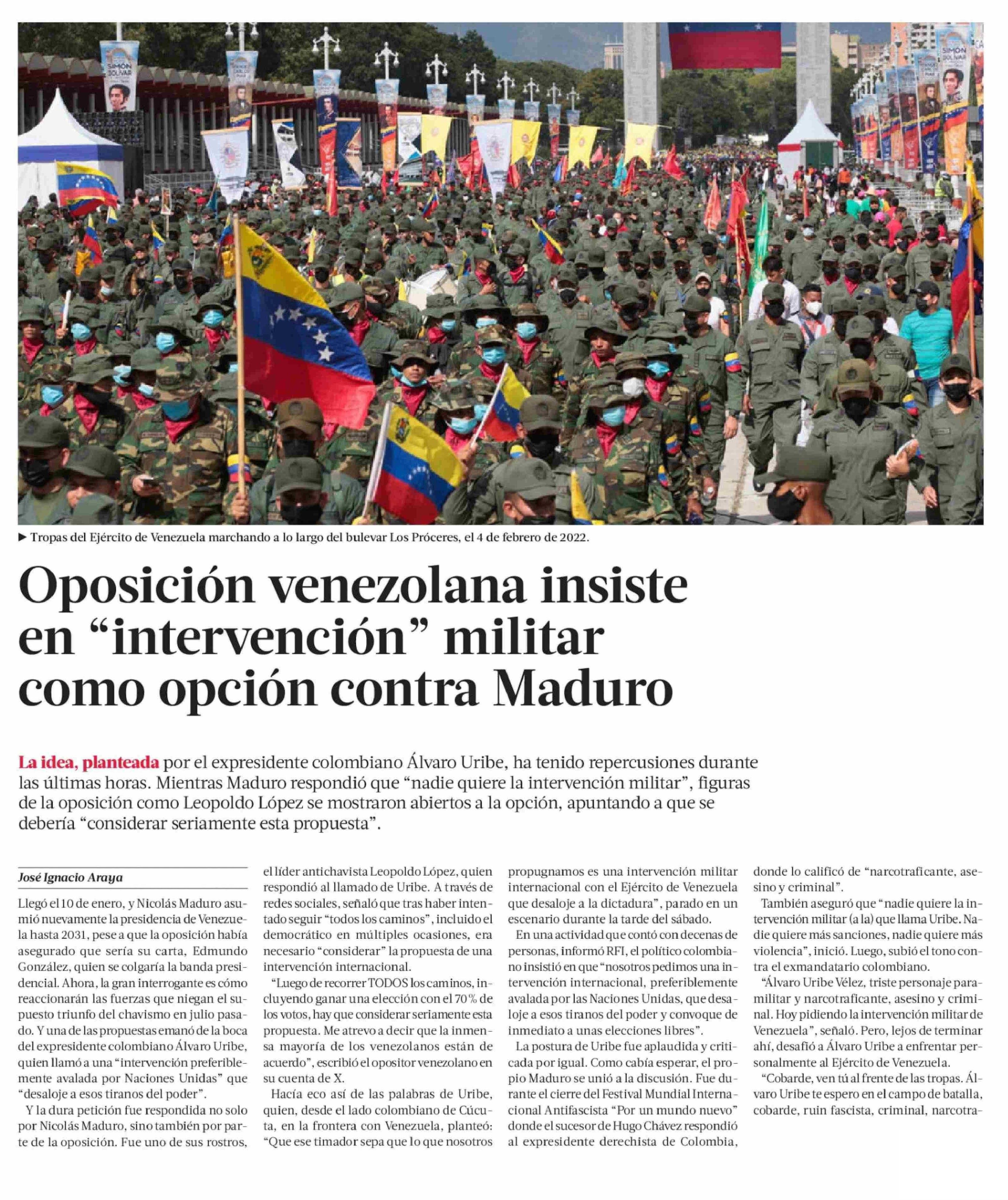 Oposición venezolana insiste en “intervención” militar como opción contra Maduro 13-01-2025 La Tercera |