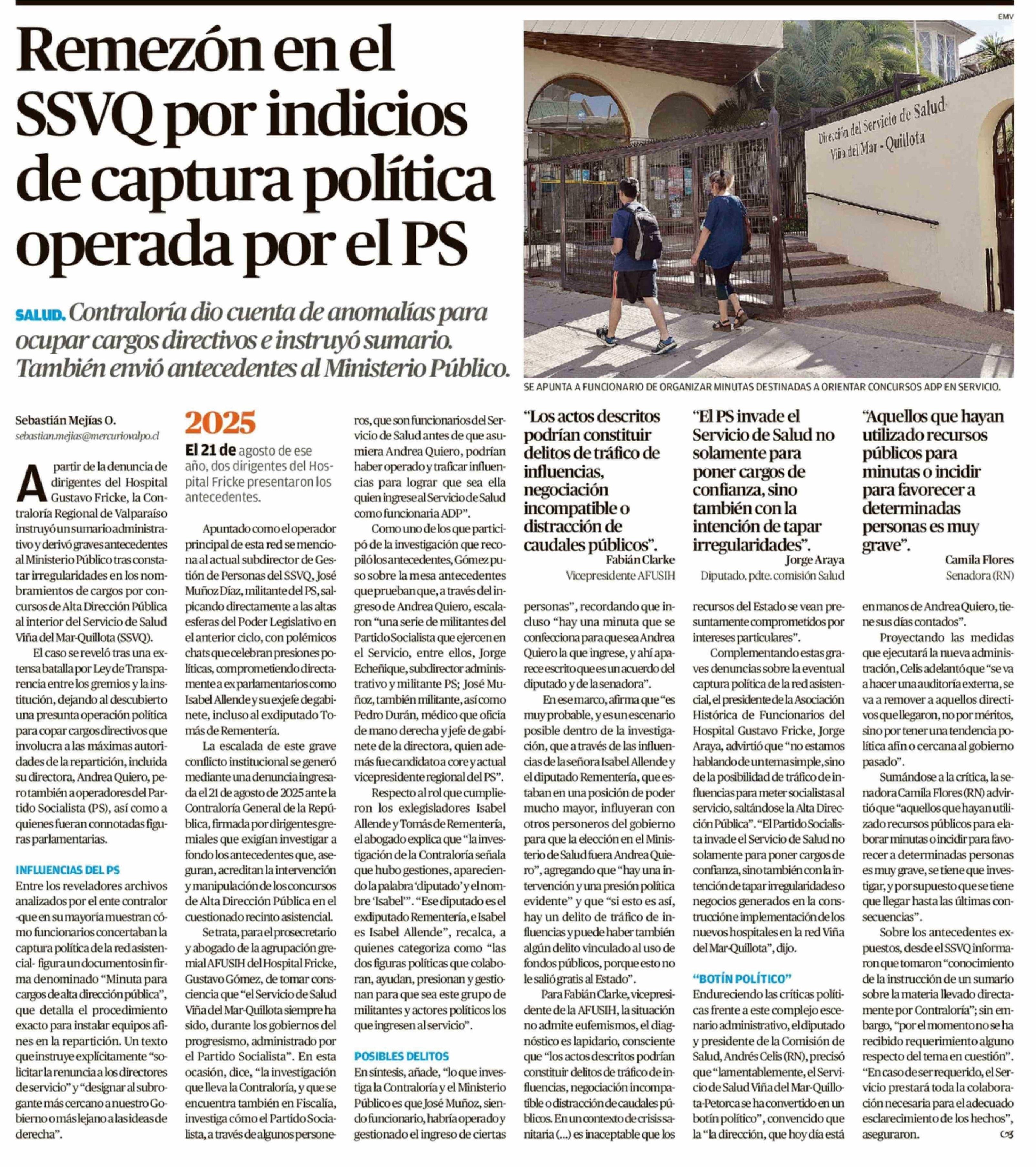 Remezón en el SSVQ por indicios de captura política operada por el PS 22-03-2026 El Mercurio de Valparaíso |