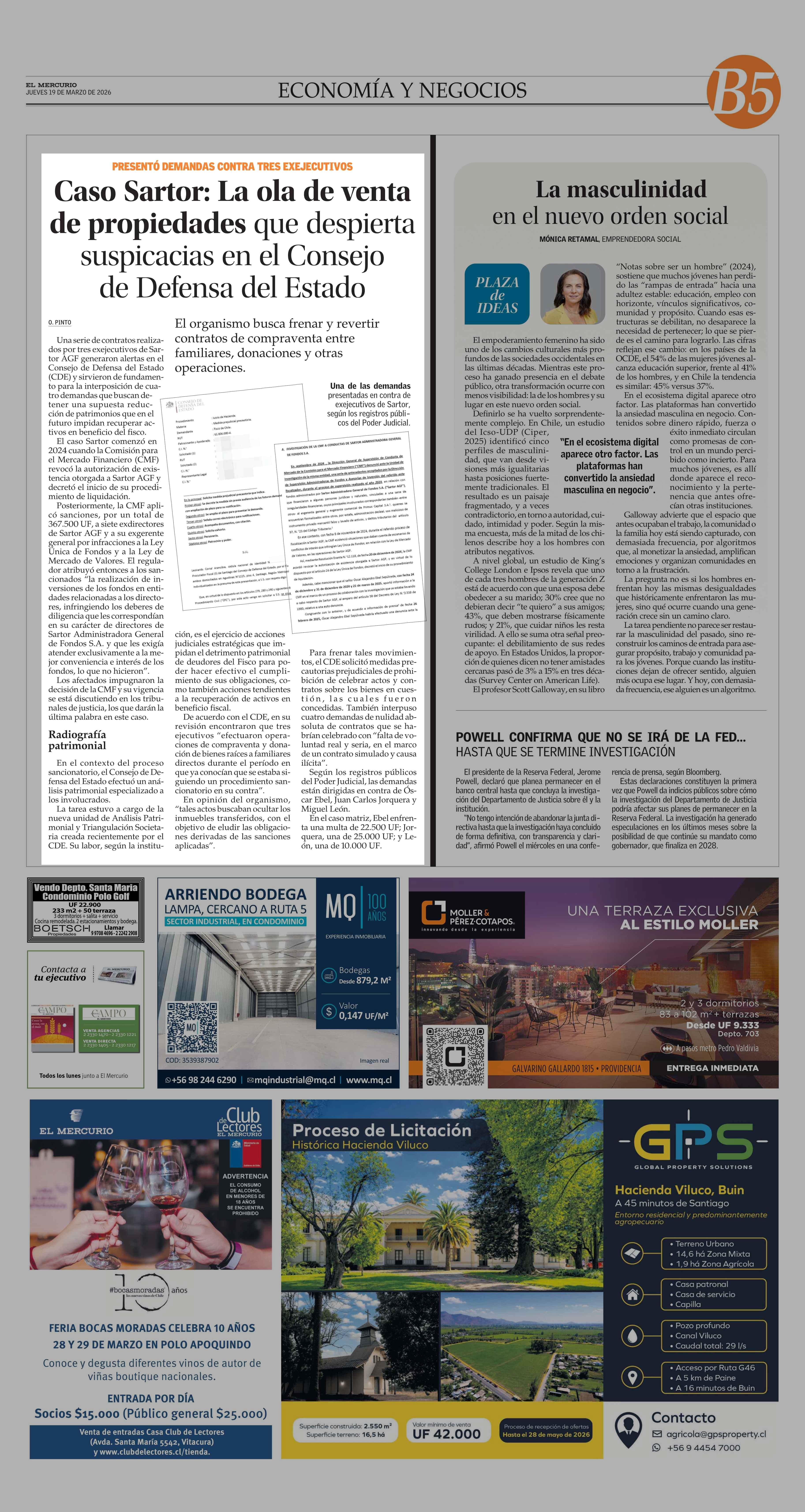 Caso Sartor: La ola de venta de propiedades que despierta suspicacias en el Consejo de Defensa del Estado 19-03-2026 El Mercurio |