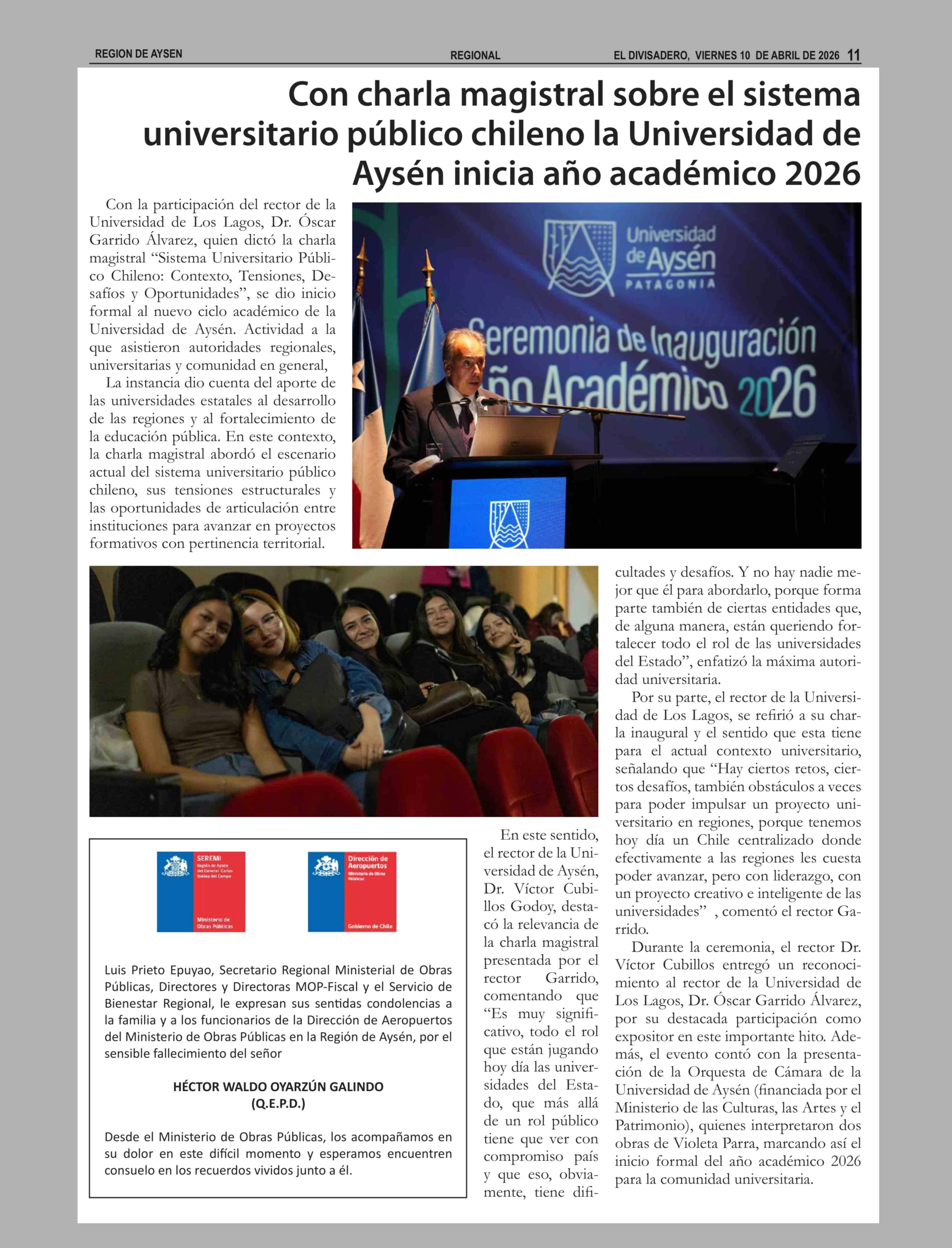 Con charla magistral sobre el sistema universitario público chileno la Universidad de Aysén inicia año académico 2026 10-04-2026 El Divisadero |