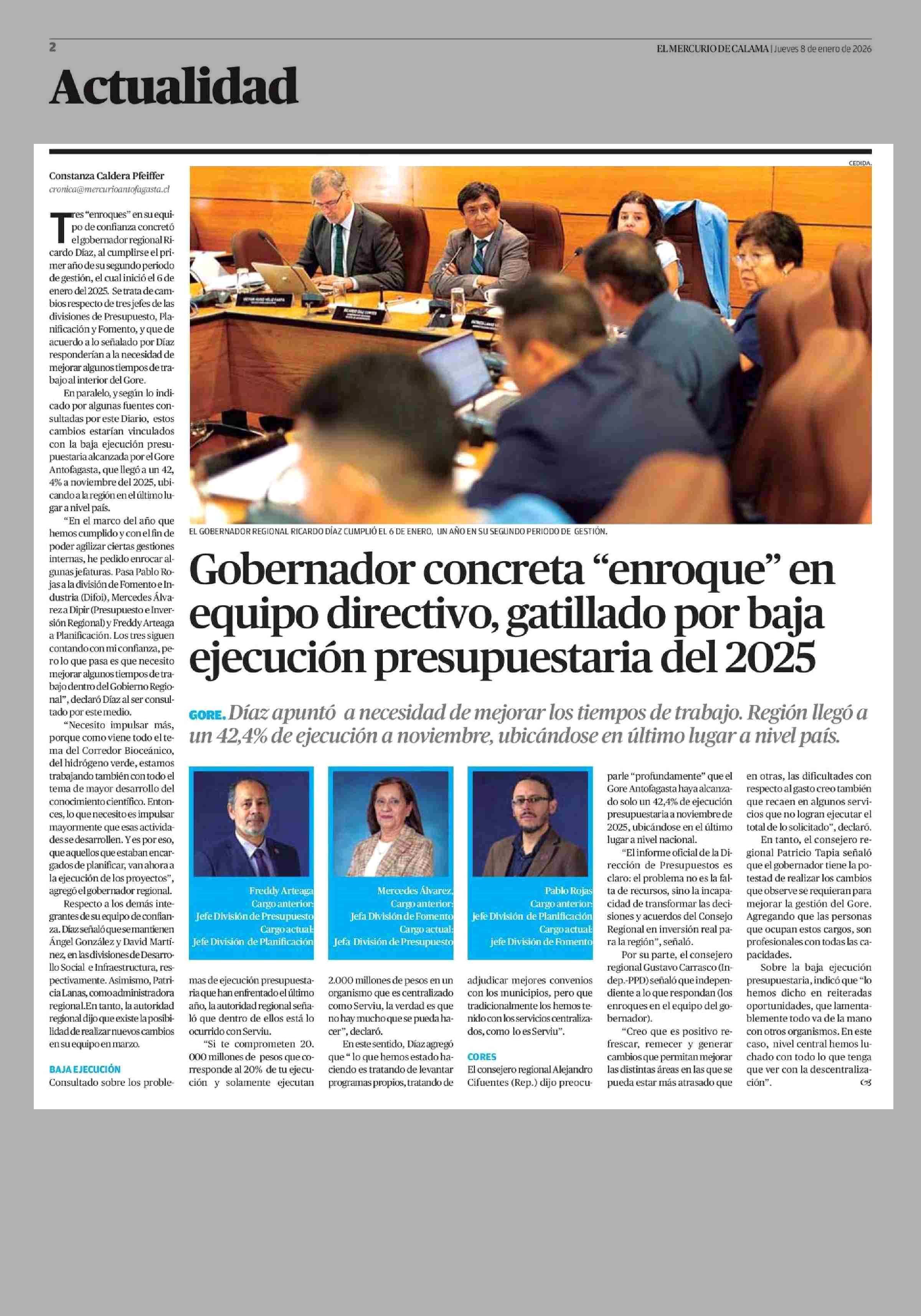 Gobernador concreta "enroque" en equipo directivo, gatillado por baja ejecución presupuestaria del 2025 08-01-2026 El Mercurio de Calama |
