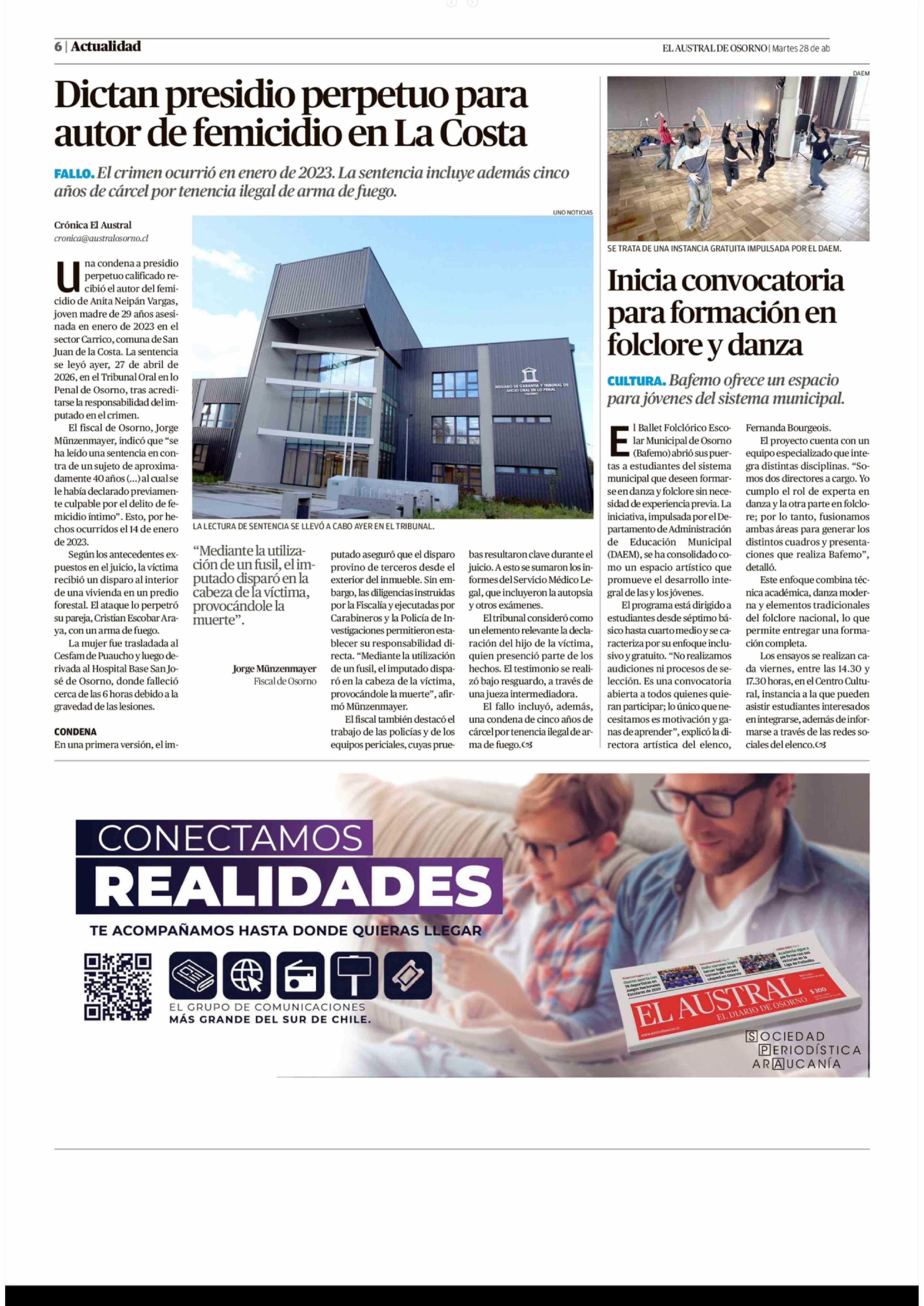 Dictan presidio perpetuo para autor de femicidio en La Costa 28-04-2026 El Austral de Osorno |