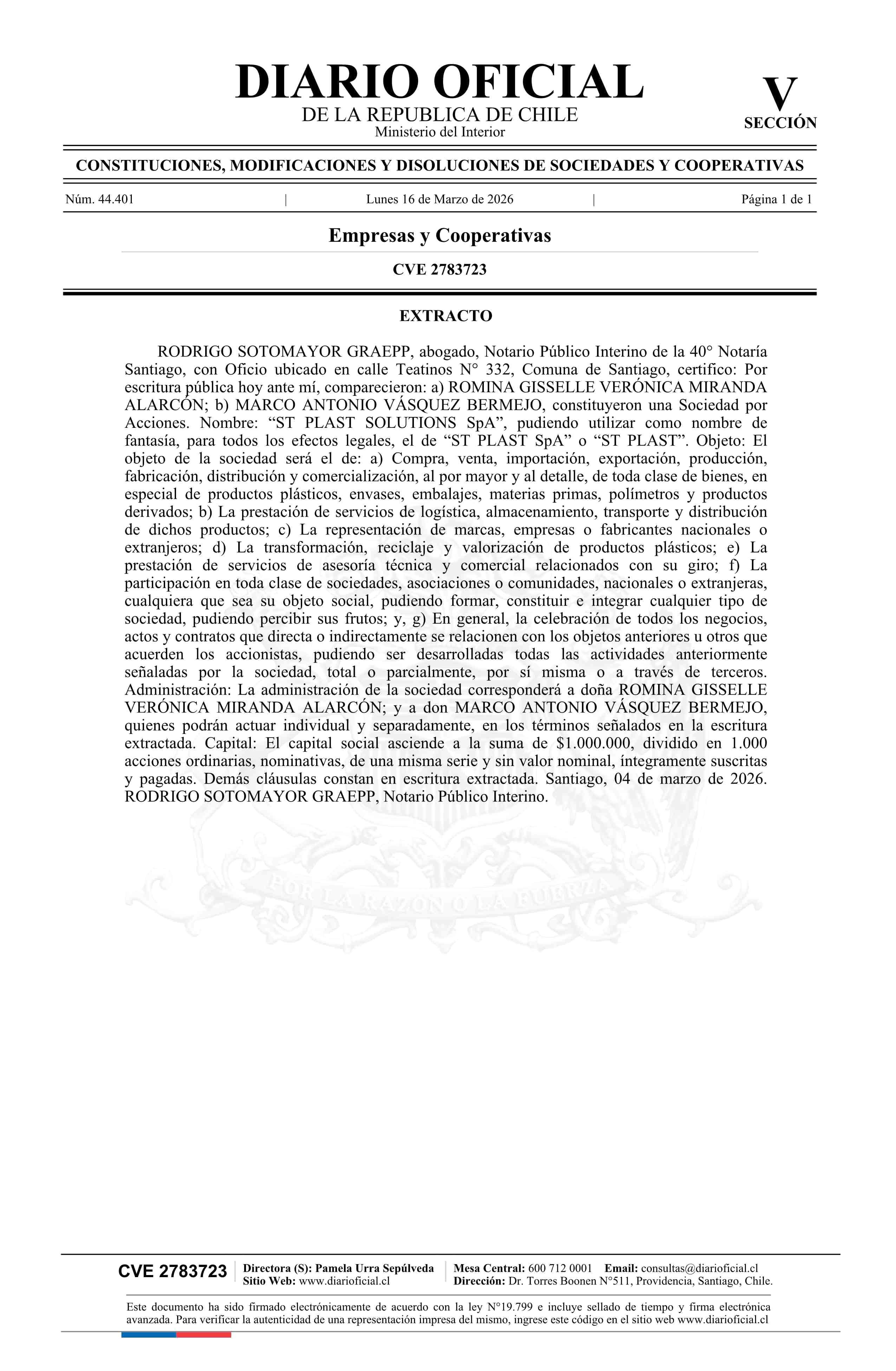 ST PLAST SOLUTIONS SpA 16-03-2026 Diario Oficial Edición Electrónica |