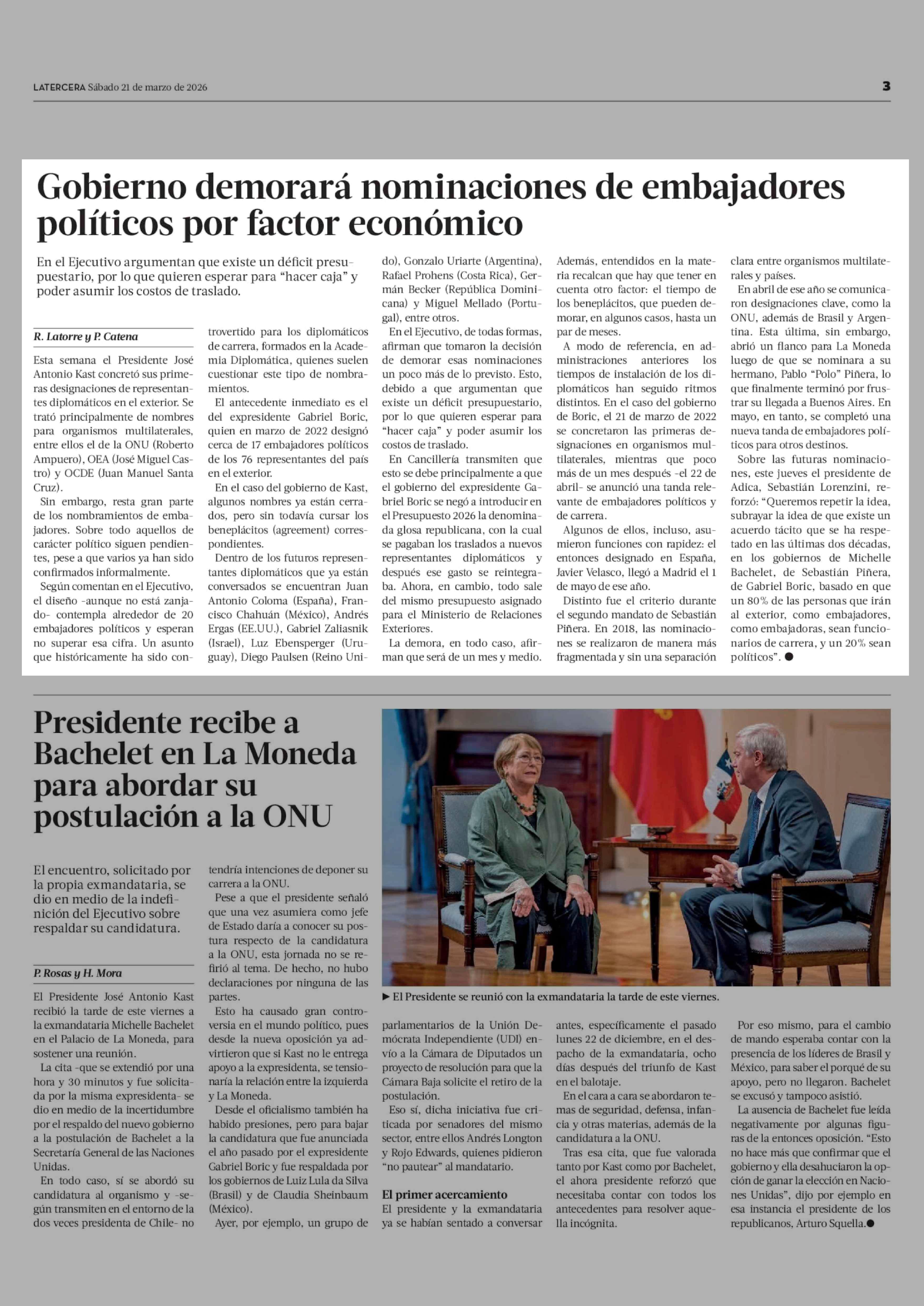 Gobierno demorará nominaciones de embajadores políticos por factor económico 21-03-2026 La Tercera |