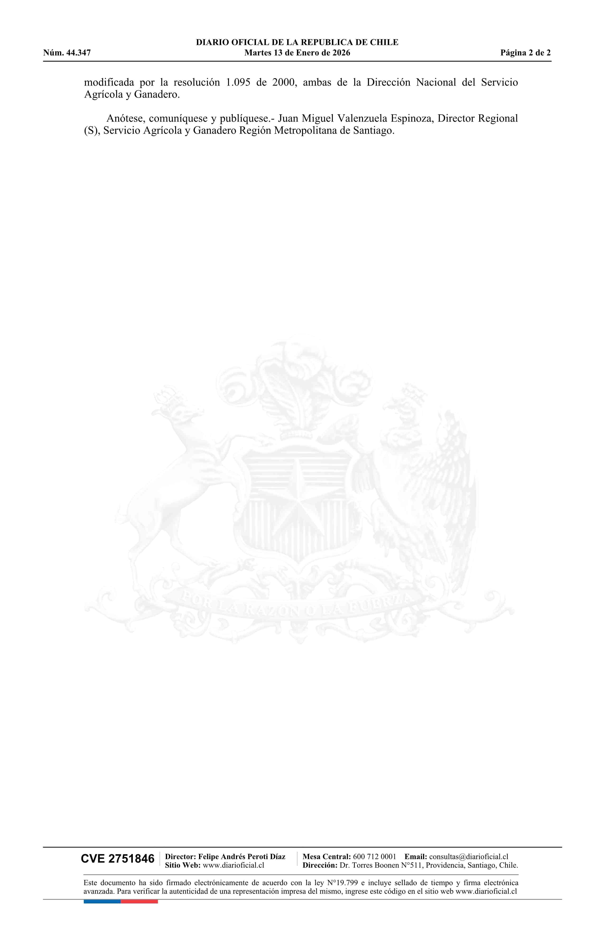Resolución exenta número 5.111, de 2025.- Declara libre de Mosca del Mediterráneo (Ceratitis capitata Wied) el área regulada que indica 13-01-2026 DIARIO OFICIAL CHILE - BOLETÍN OFICIAL DE MINERÍA |