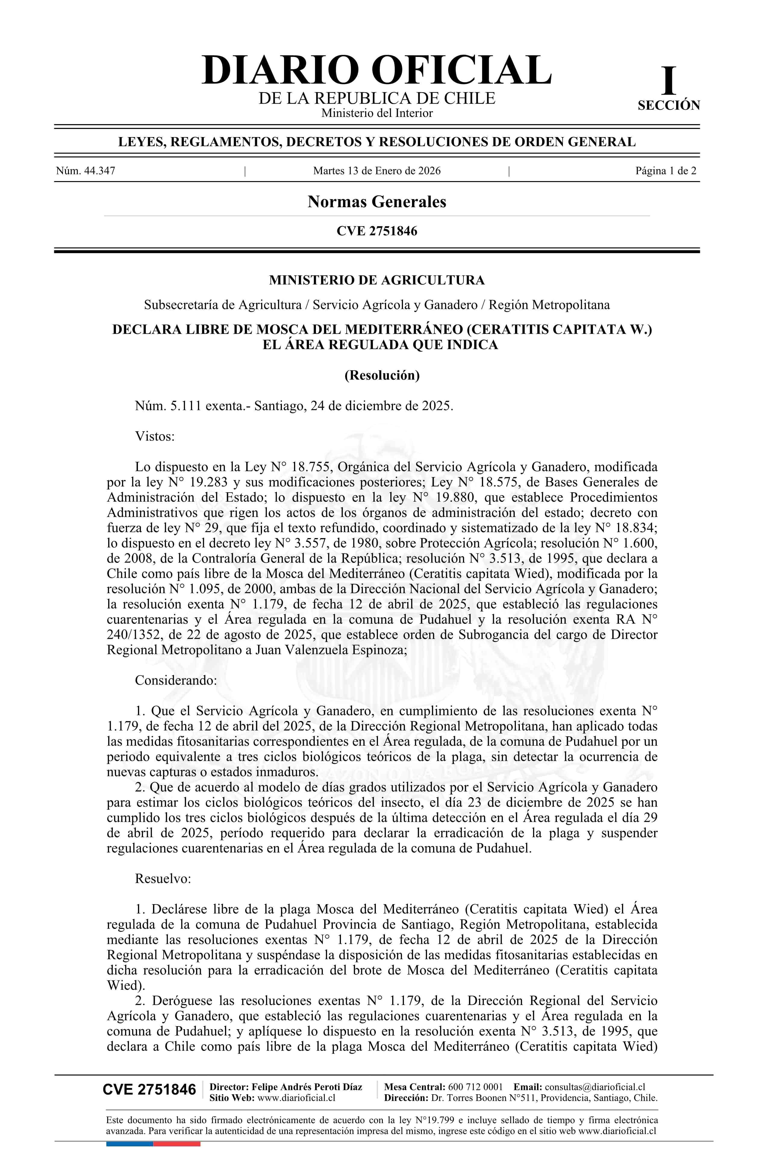 | Título: | Resolución exenta número 5.111, de 2025.- Declara libre de Mosca del Mediterráneo (Ceratitis capitata Wied) el área regulada que indica |