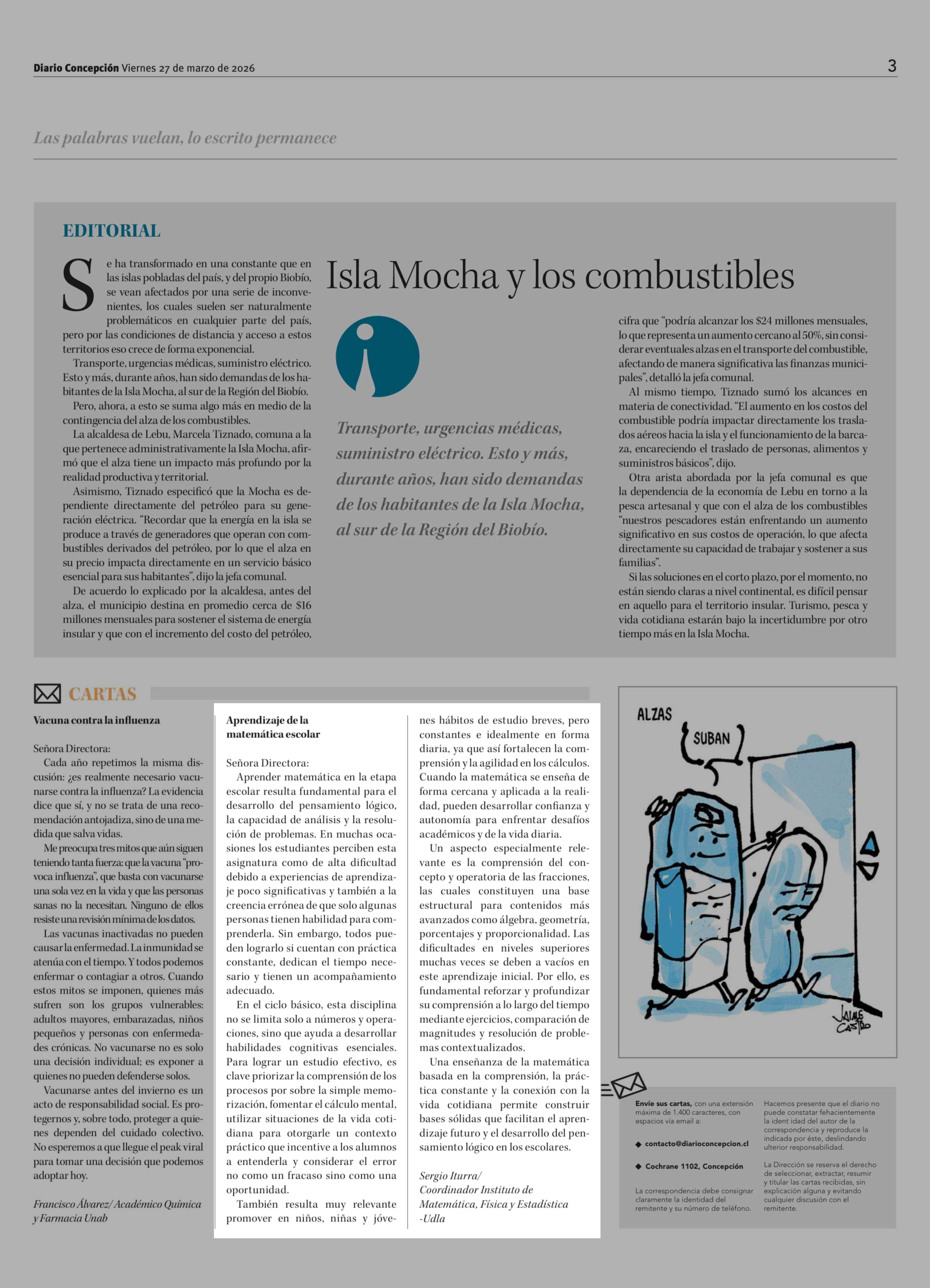 Cartas: Aprendizaje de la matemática escolar 27-03-2026 Diario Concepción |