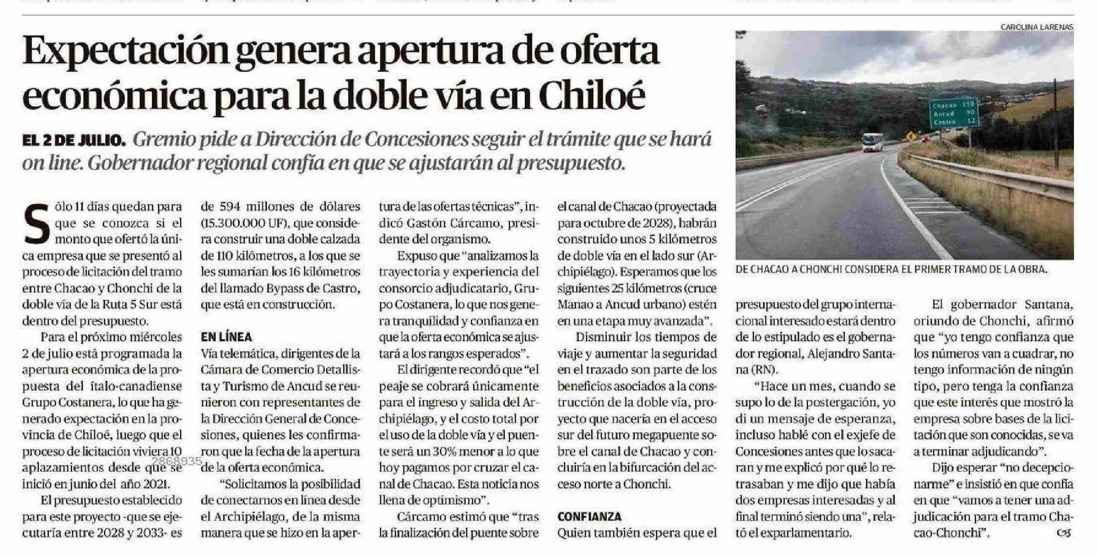 Expectación genera apertura de oferta económica para la doble vía en Chiloé 21-06-2025 El Llanquihue |